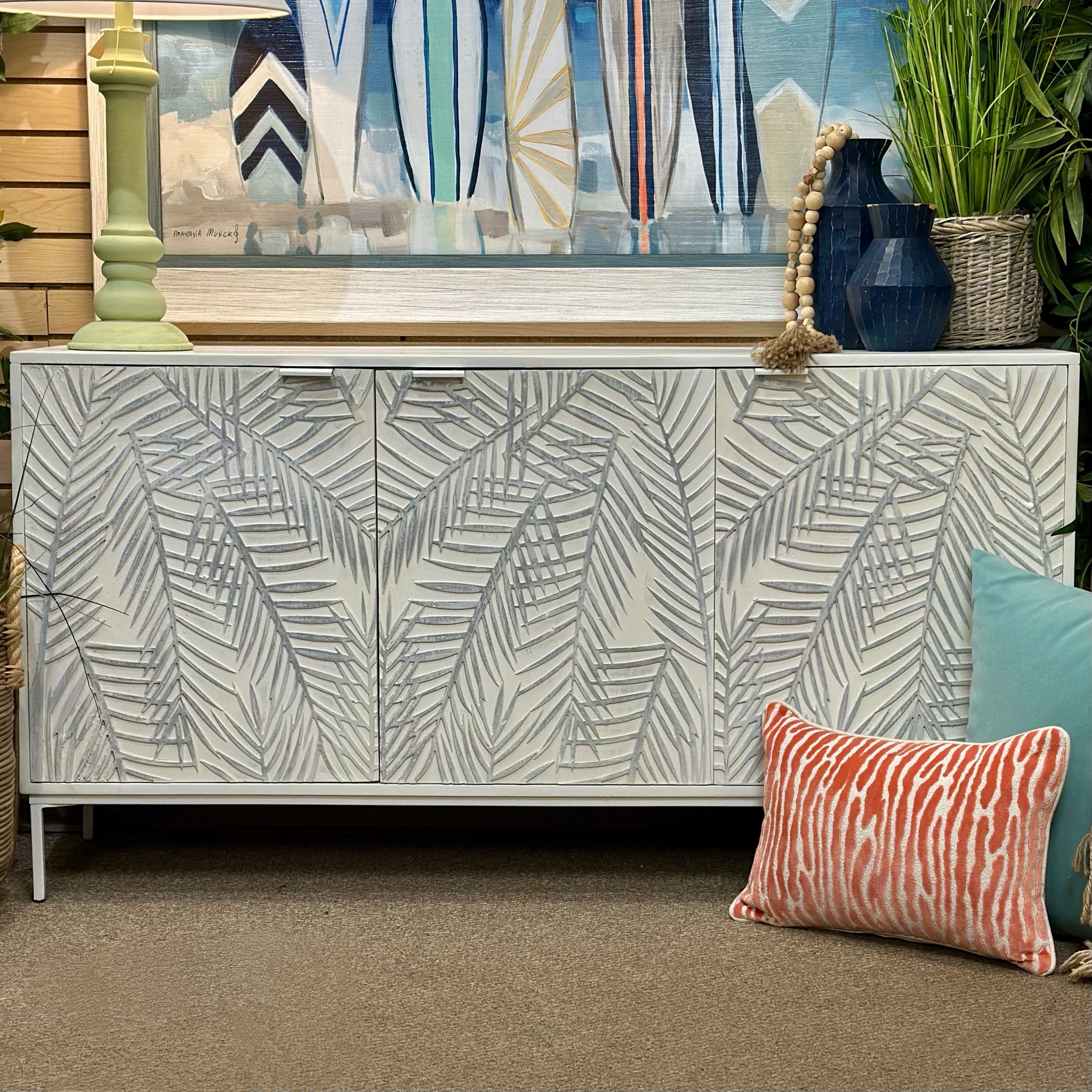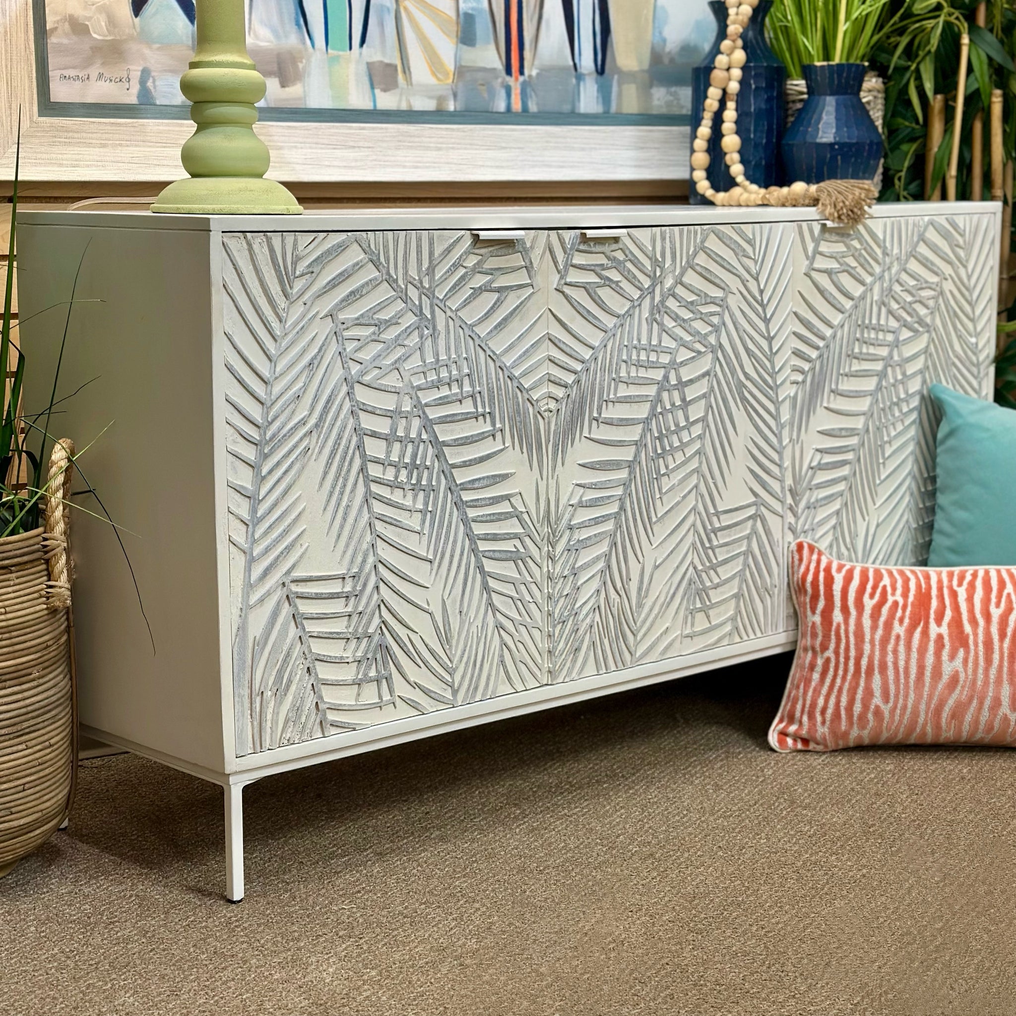 Coastal elegant cabinet in an ivory wood finish. Features carved palm leaves details on door fronts. Brand New!