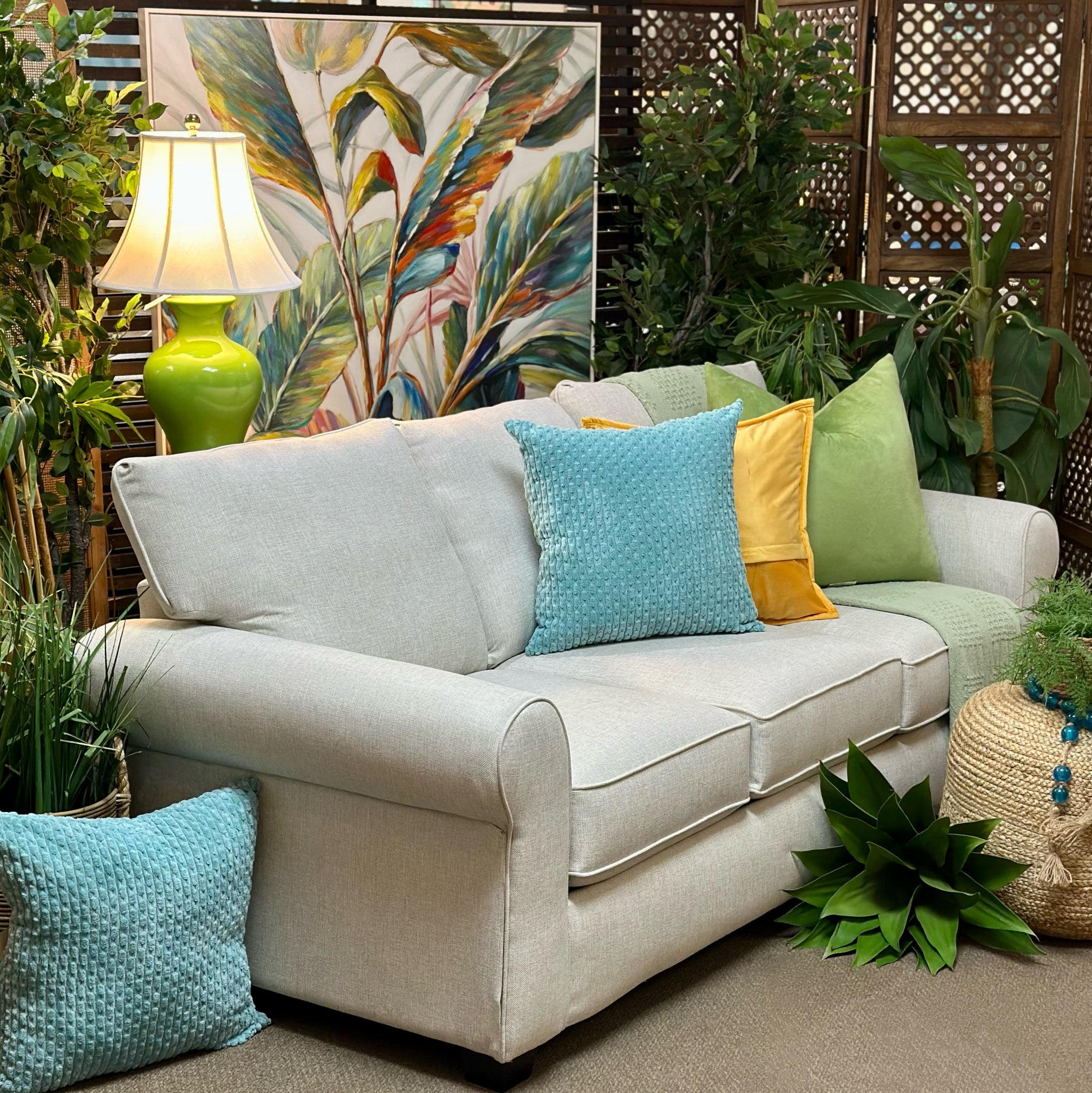 Gorgeous, brand new sleeper sofa in durable ivory revolution upholstery. Sofa features rolled arms and queen size pull out gel memory foam mattress.