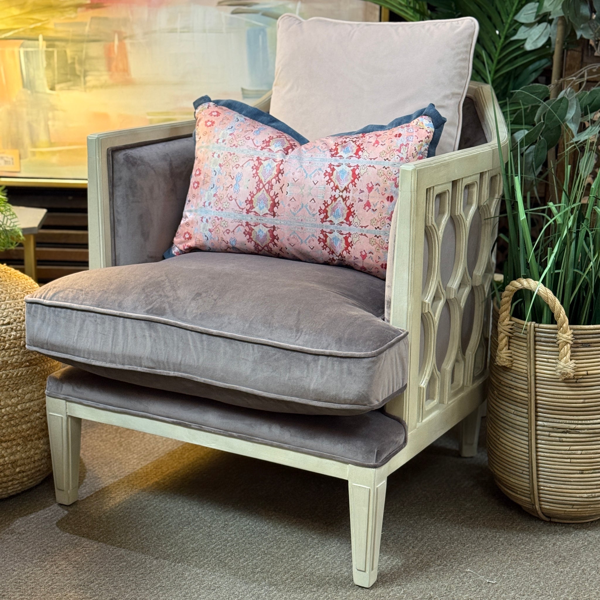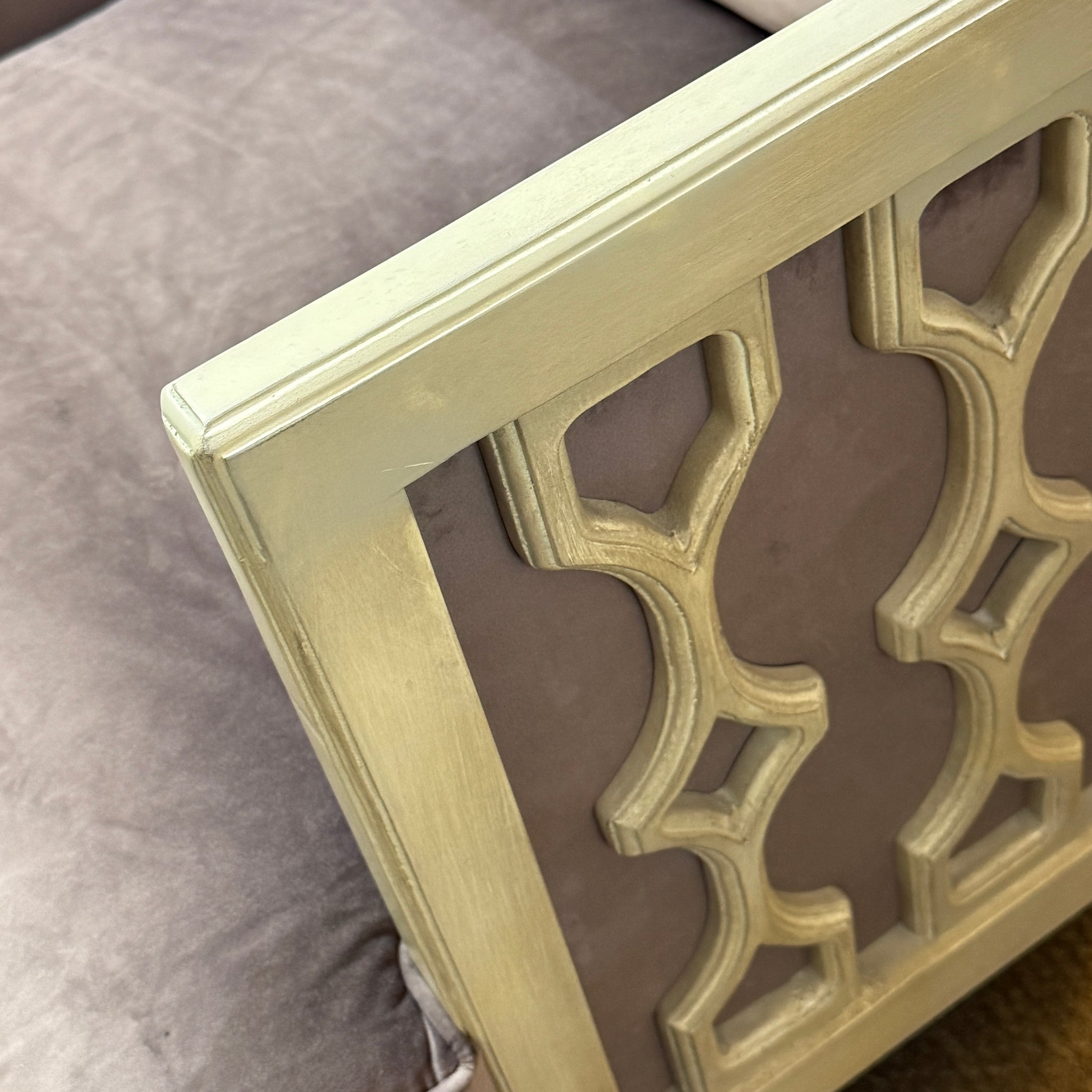 Consignment score! This luscious honeycomb style accent chair came to us on consignment but BRAND NEW in the packaging! Has an ivory washed wood frame with light lavender velvet-light upholstery and a contrasting blush velvet-like back pillow. A fab find!