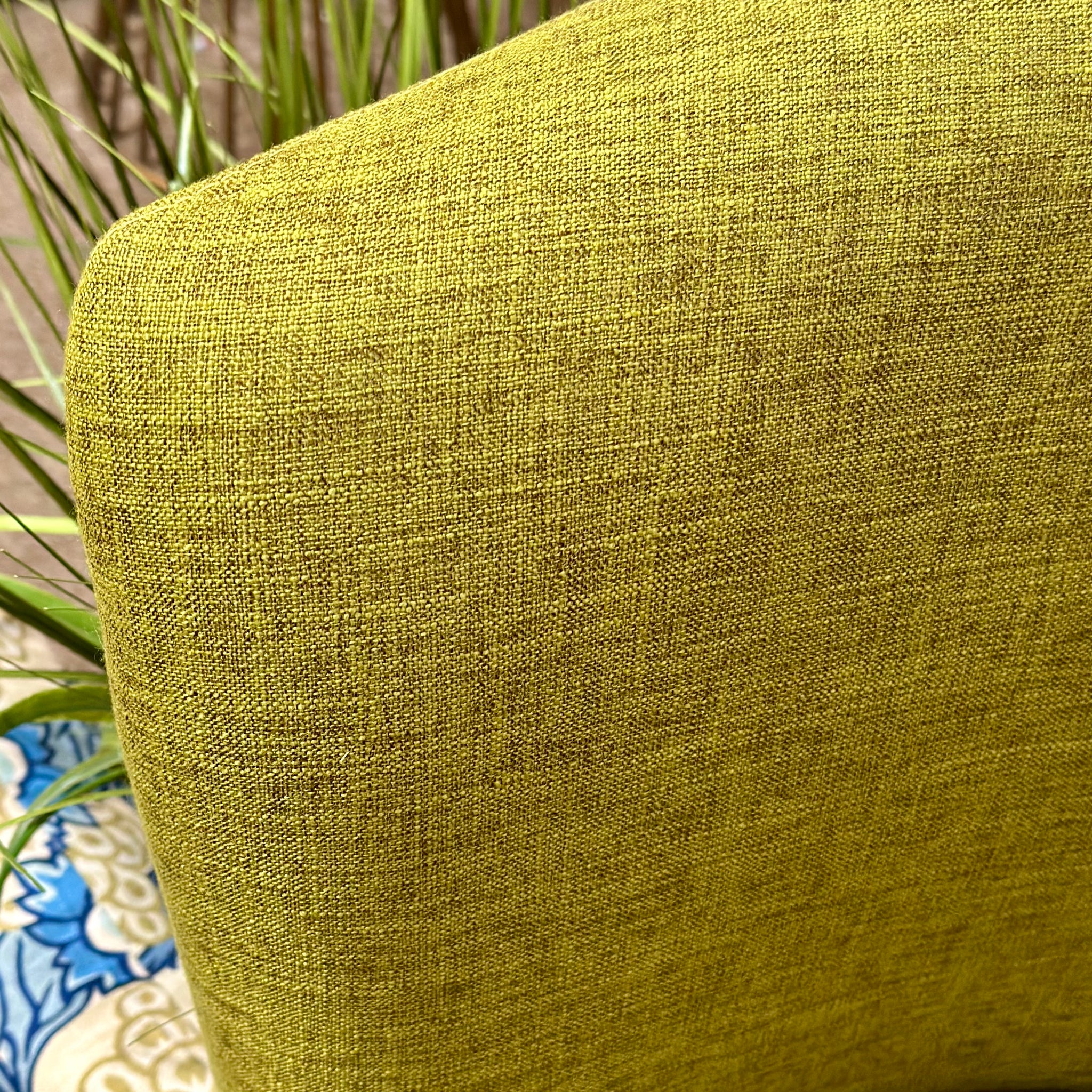 Elevate any space with this gorgeous swivel accent chair. Features a bold, lemongrass color fabric and a rounded frame. Brand new!