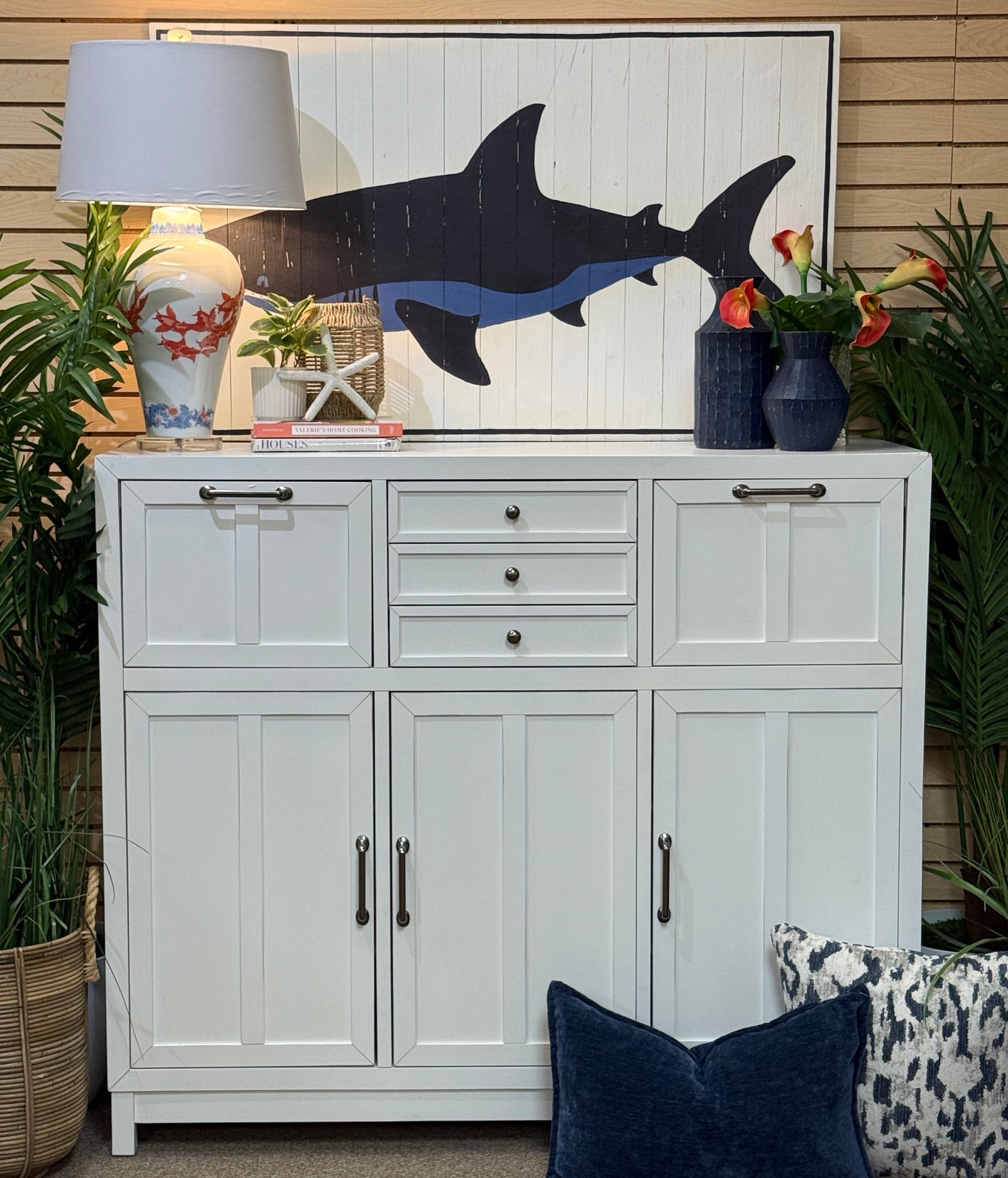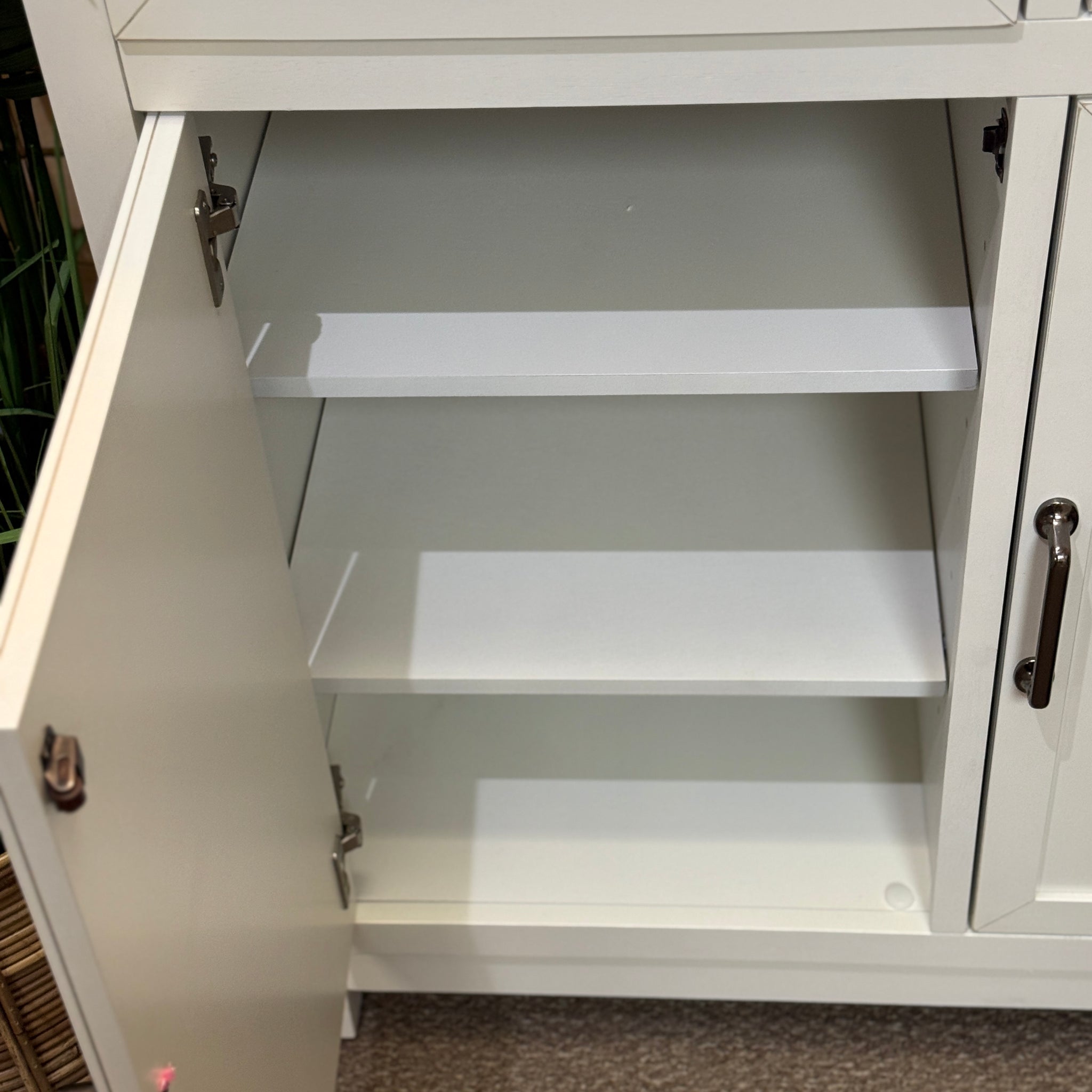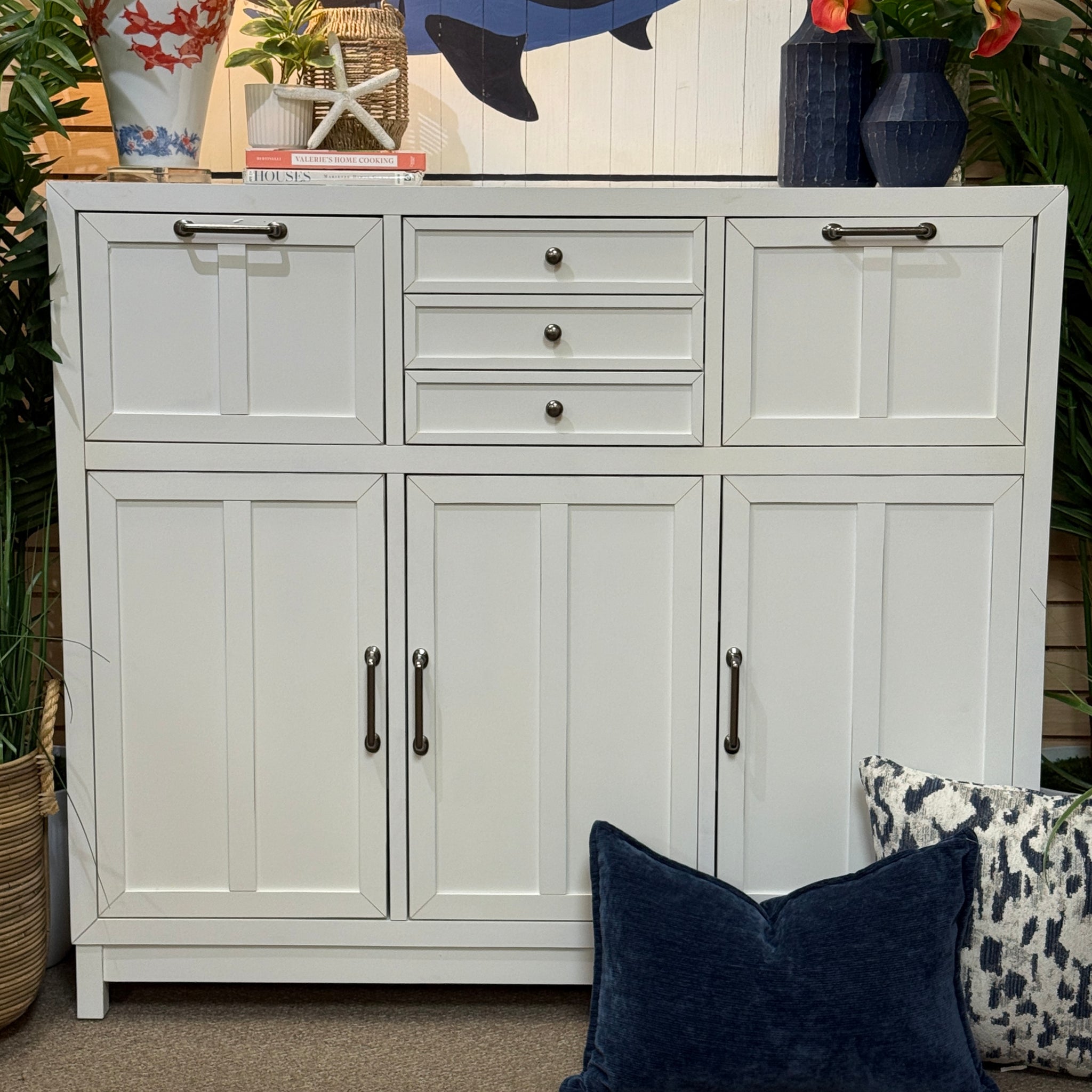 Opportunity buy! This brand new buffet features a TON of storage options for all your dining and serving essentials. See the 'Cape Cottage' cabinet online for $1,000+, our price less with minor corner blemish as shown.