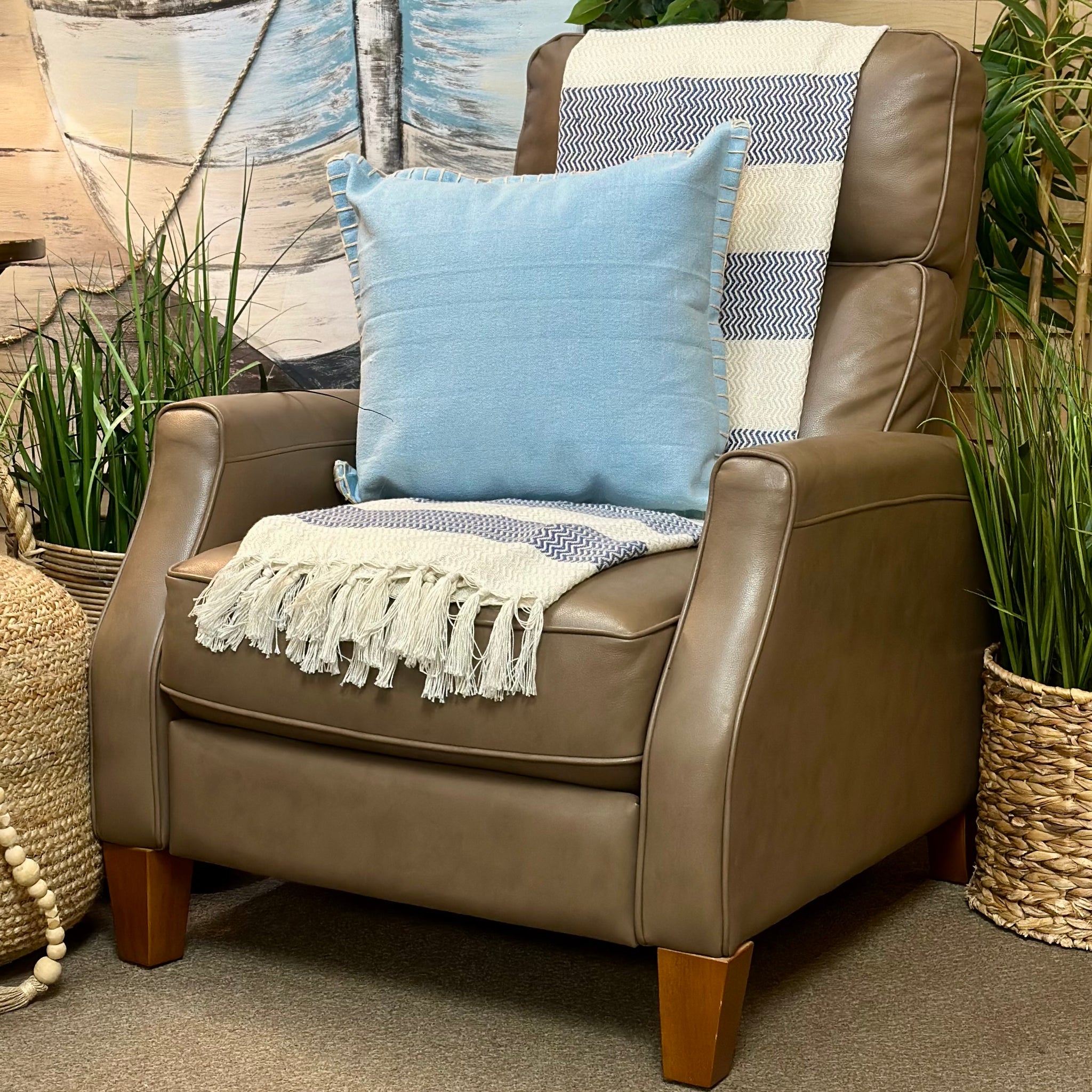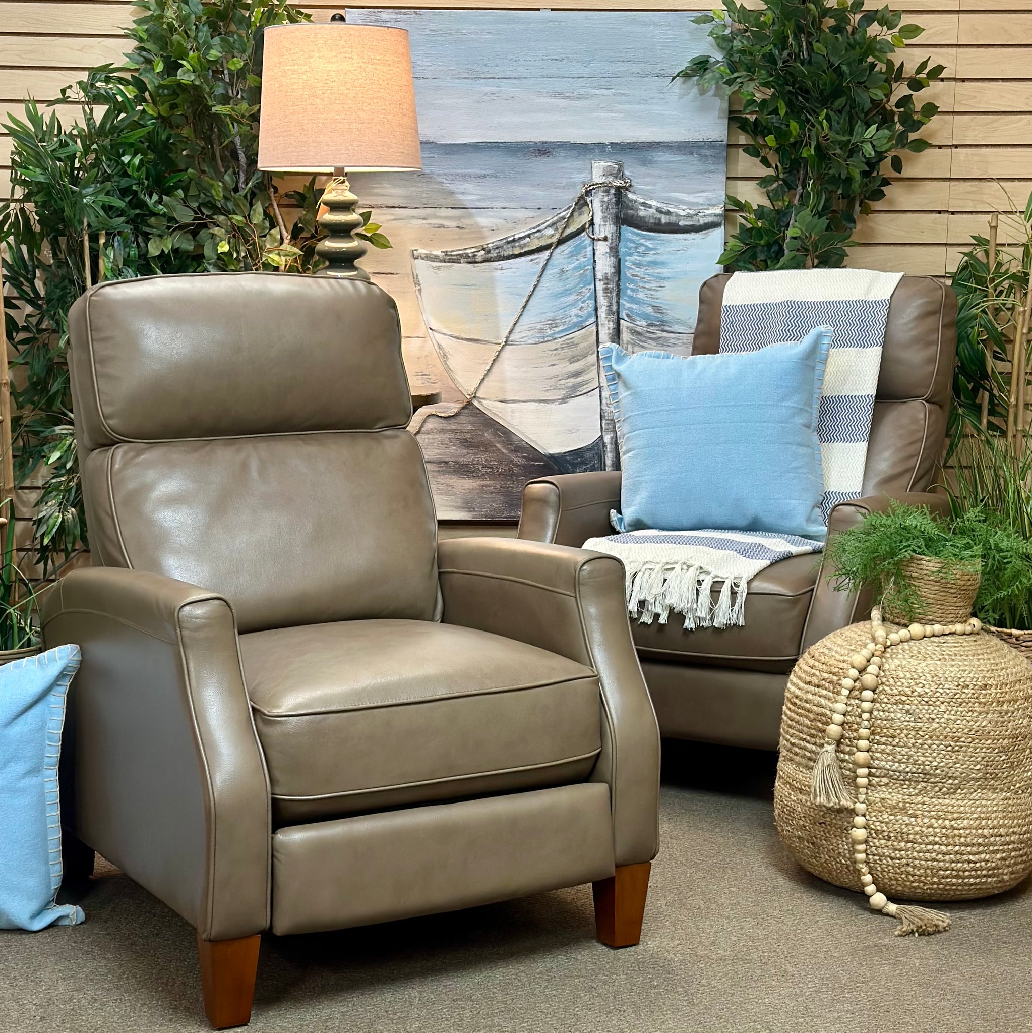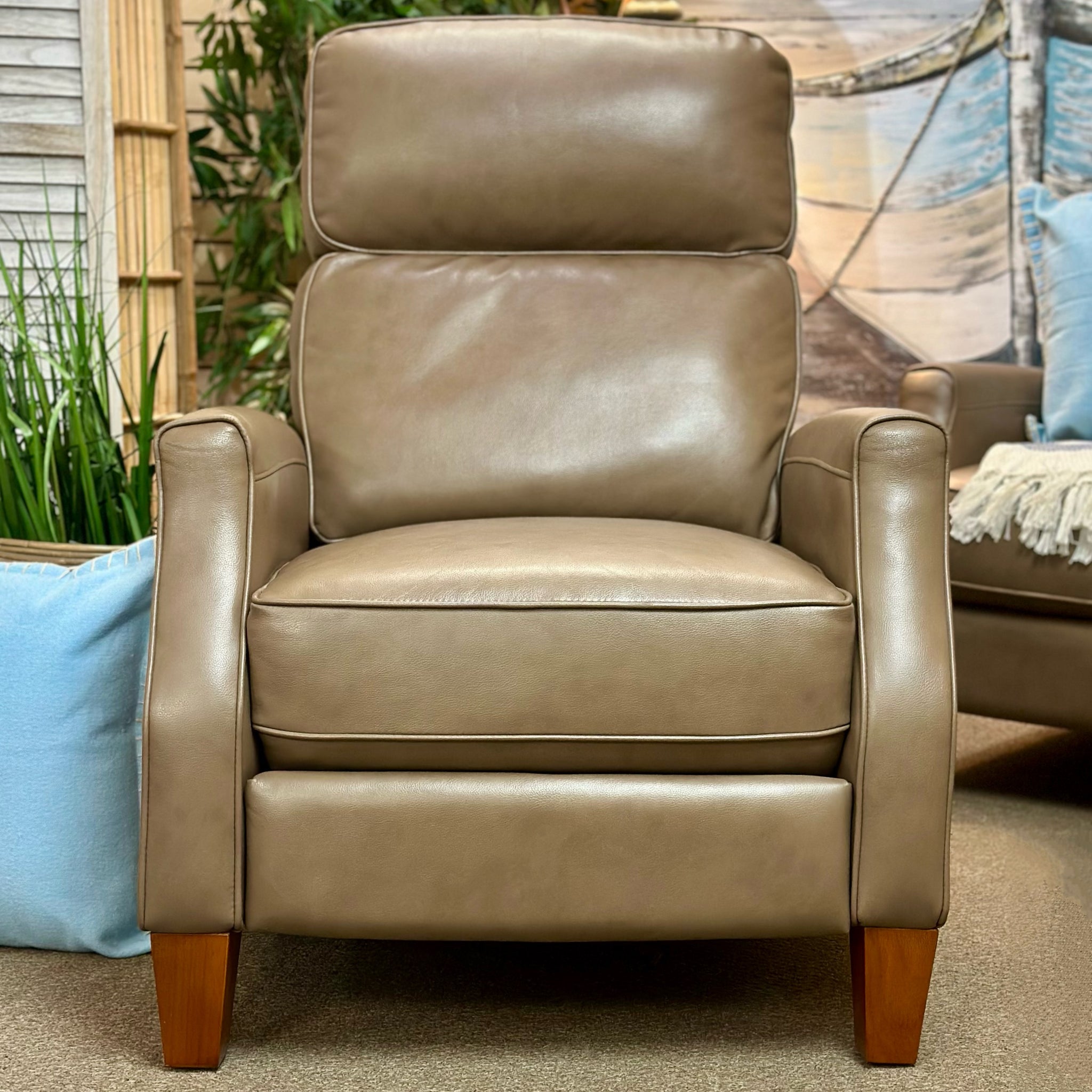 Handsome recliner in a mocha color, leather-like material. Features sloped arms and corded trim. Reclining mechanism is manual push back. On consignment and in excellent condition!