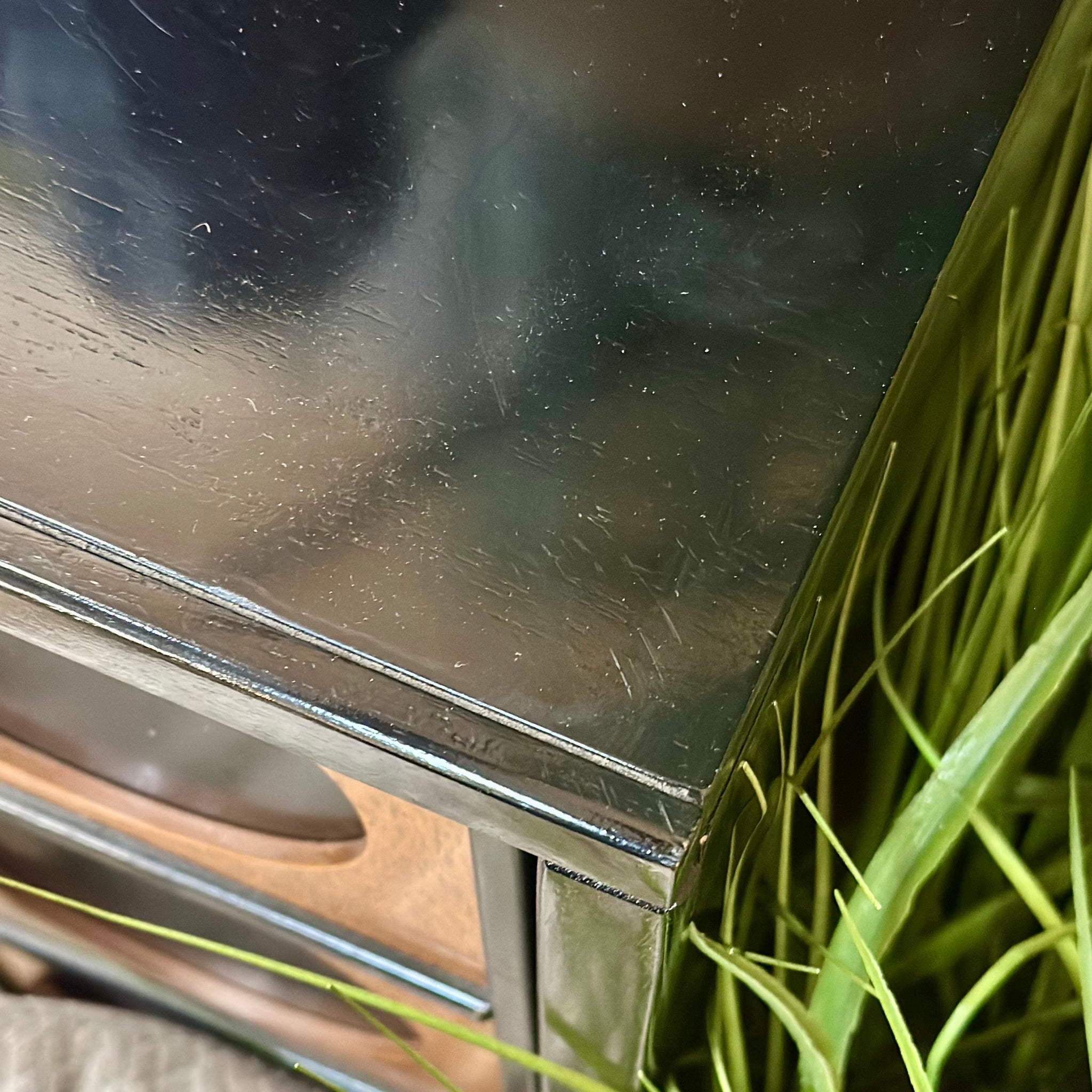 Give your space a modern feel with this handsome cabinet. Features two sliding doors with a cutout circles pattern, black and natural wood finish. In good condition however it is missing the back panel, one door does not slide and has some minor finish flaws. Priced accordingly.