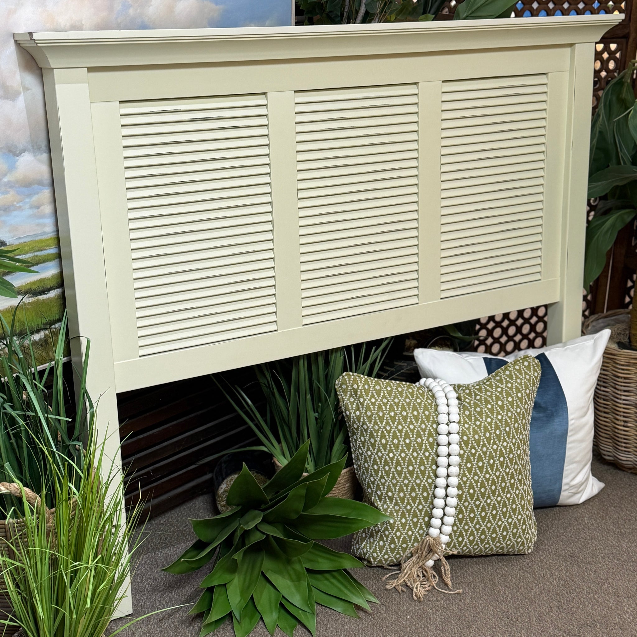 Elevate your bedroom with this handsome headboard by Pier 1. Features a shutter design with an distressed ivory finish. Has a minor finish blemish on one corner. Headboard only.