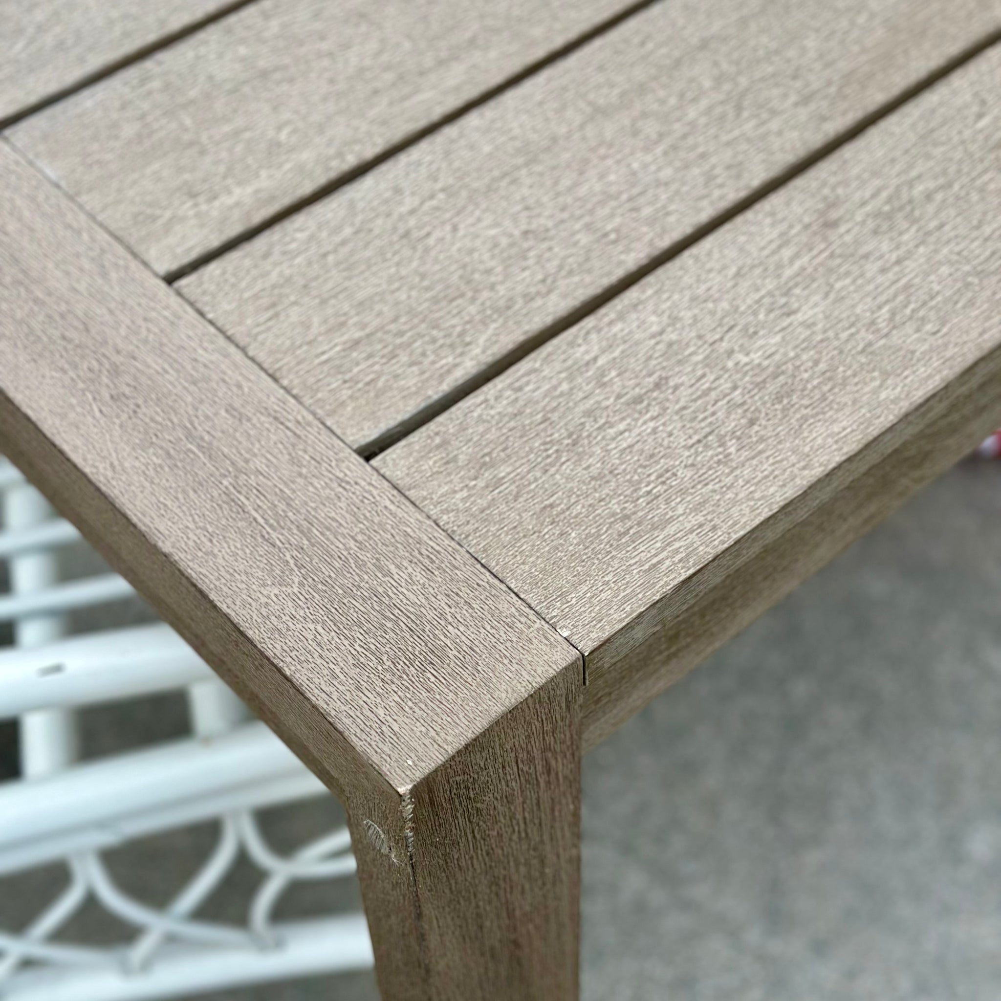 Gorgeous outdoor dining table from quality manufacturer Restoration Hardware. Features teak wood in a driftwood finish and a linear silhouette and clean geometry inspired by midcentury modernism. On consignment and in excellent condition. Retails $2,600, our price less!