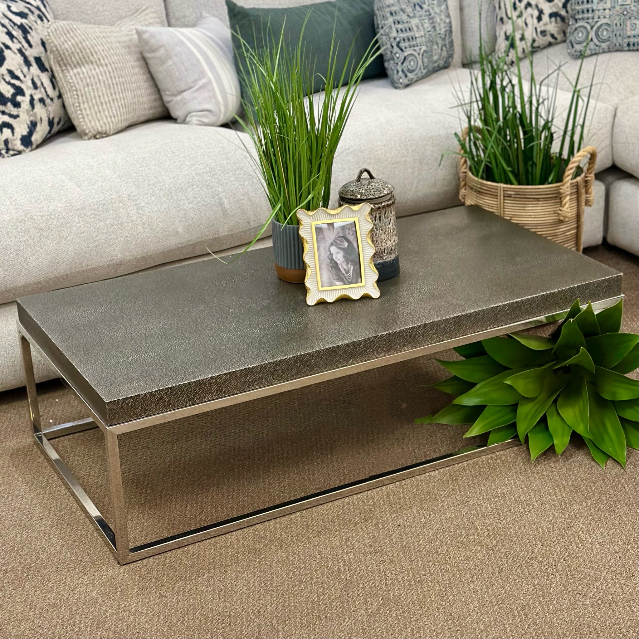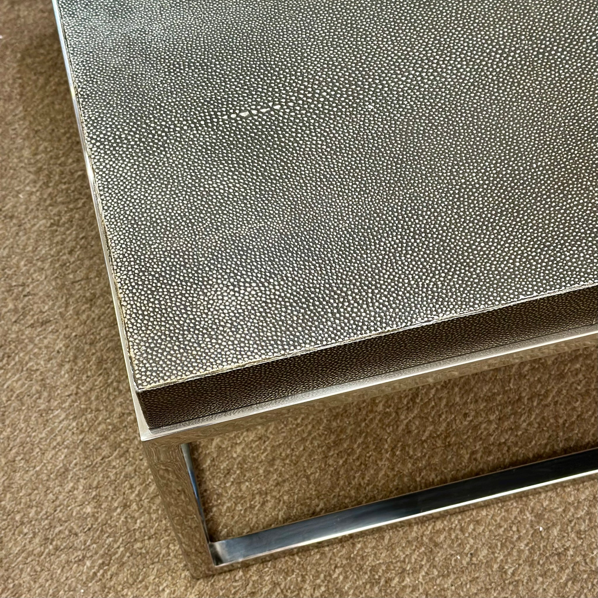 Elevate your space with this stunning coffee table by Restoration Hardware. Features a graphite shagreen top and a chrome metal base. In great condition with some minor finish blemishes. Similar ones retail for $1695+, our price less!