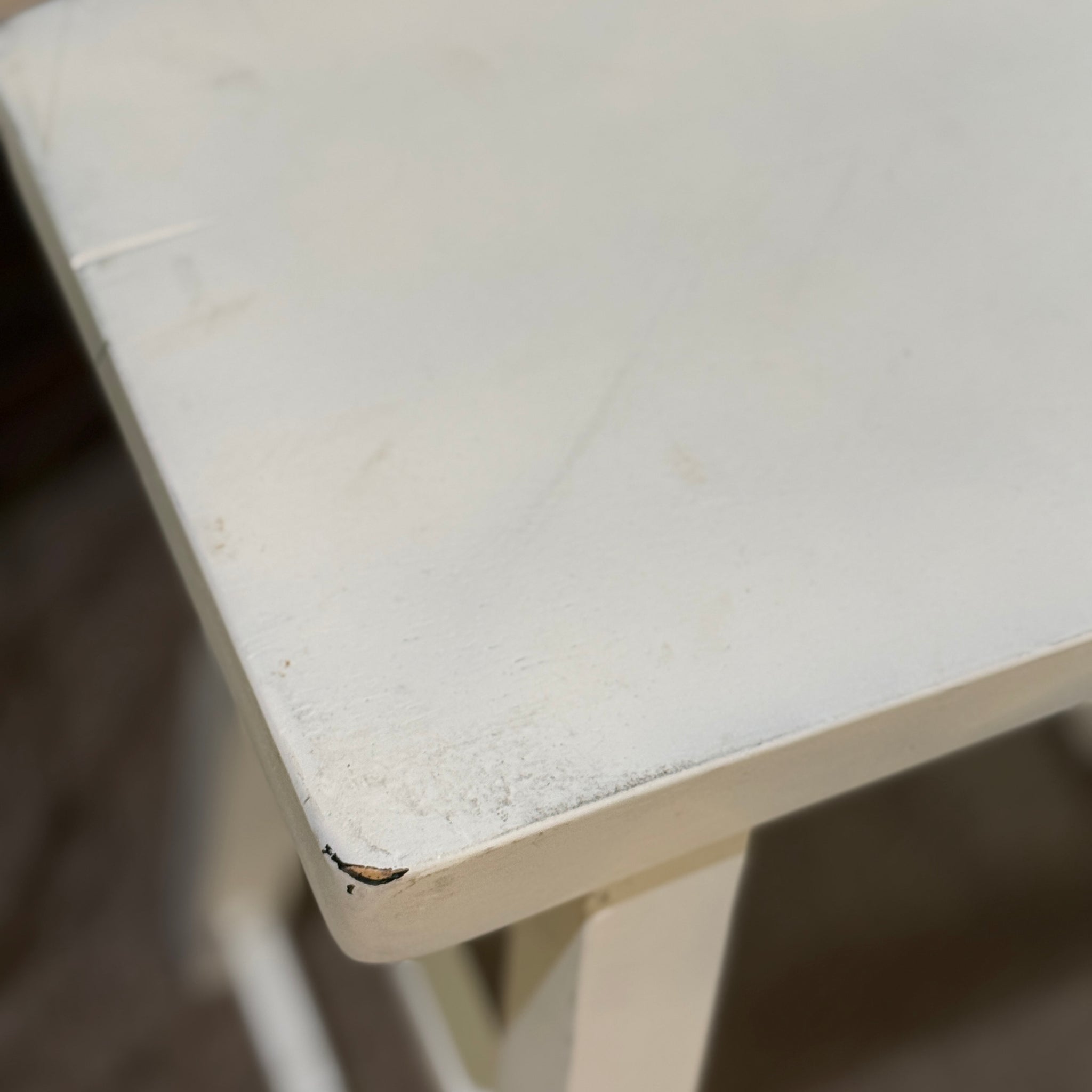 Add these handsome stools to your kitchen space. Features a saddle design and distressed white finish. In good condition.