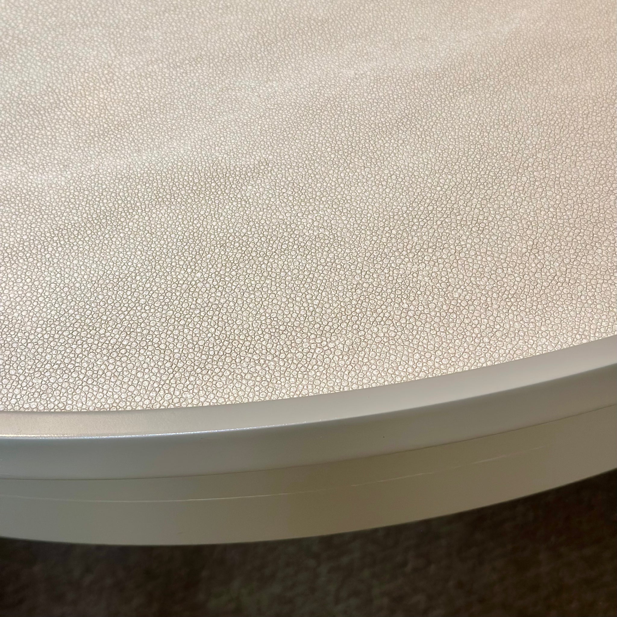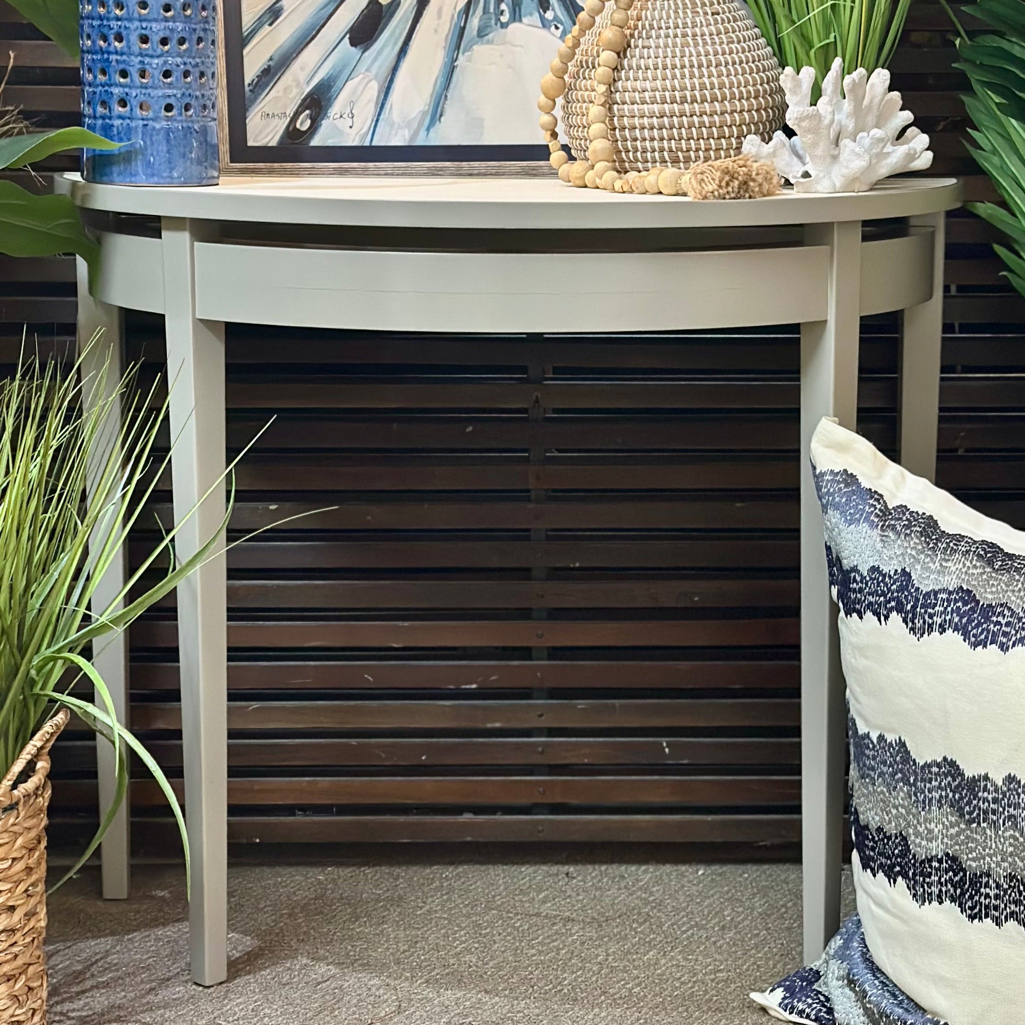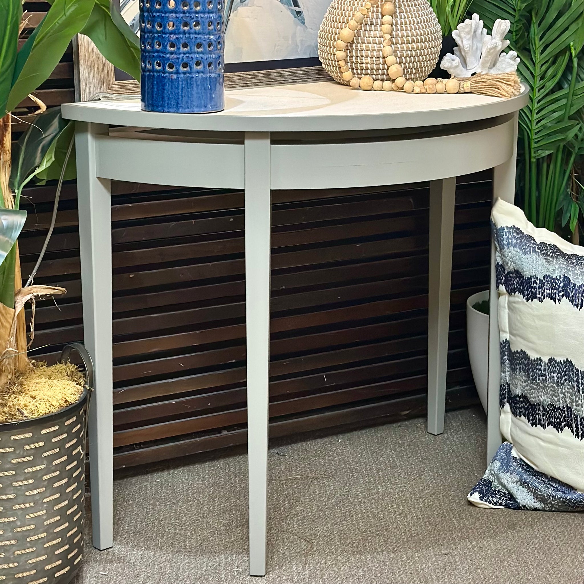 High quality demilune console just in on consignment and in excellent condition! Features a shagreen top with dove grey finish.