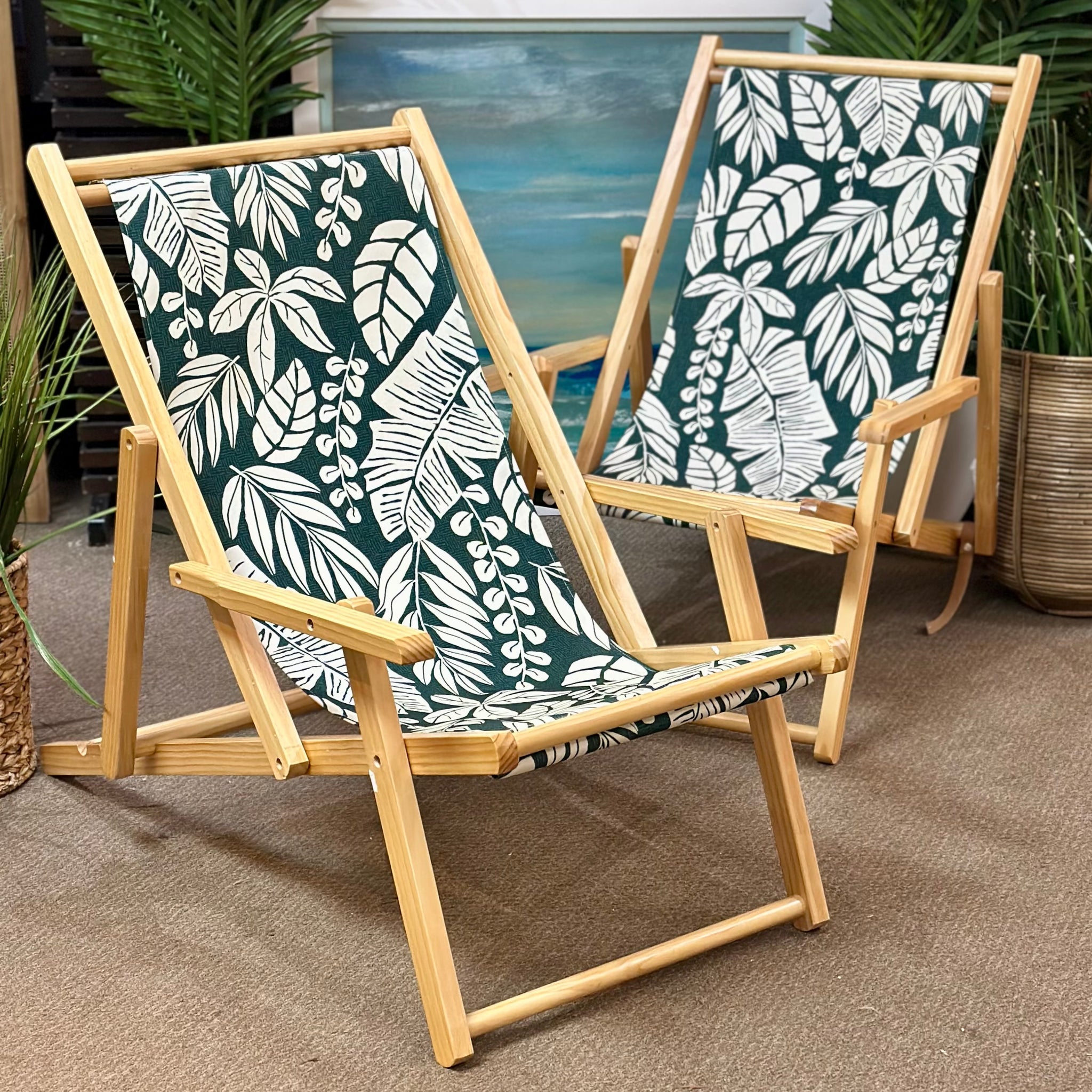 Super cute beach or patio sling back folding chairs with a fun leafy print. In on consignment and in like-new condition.