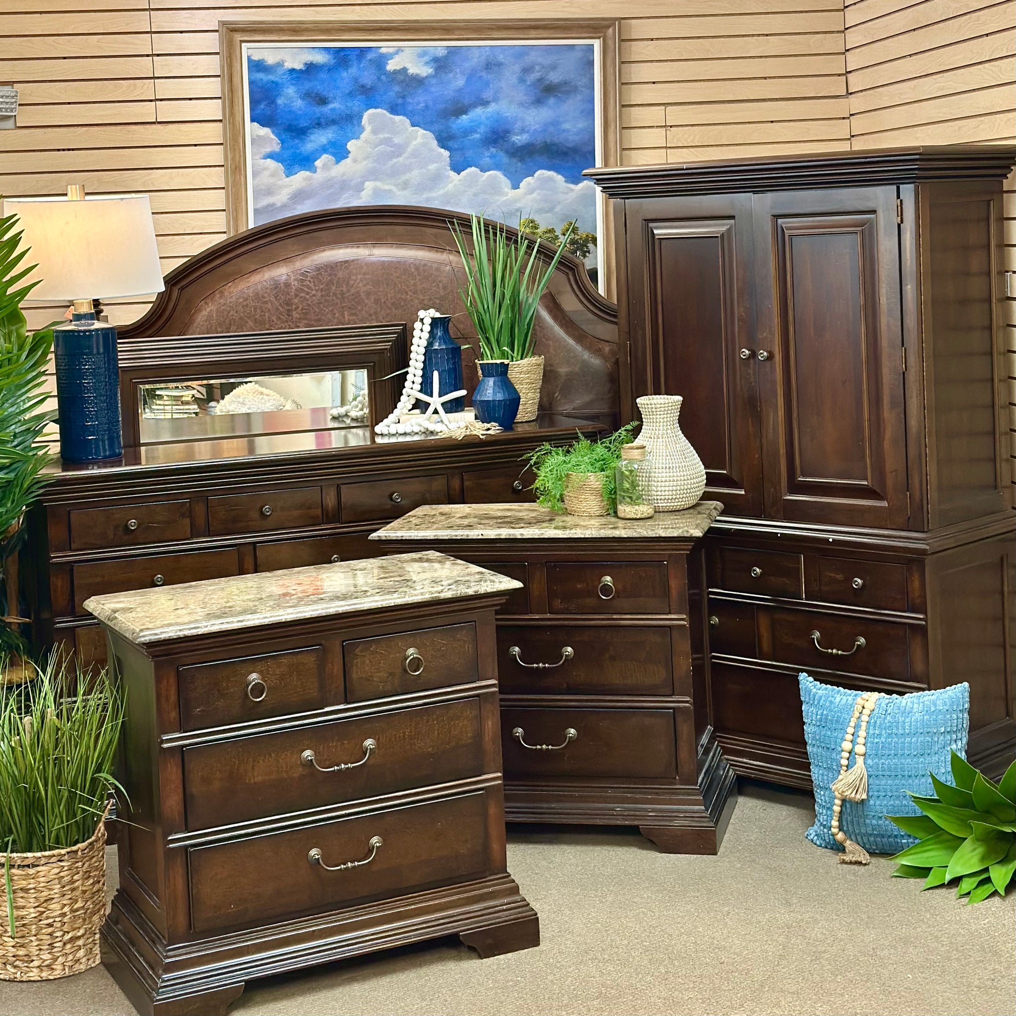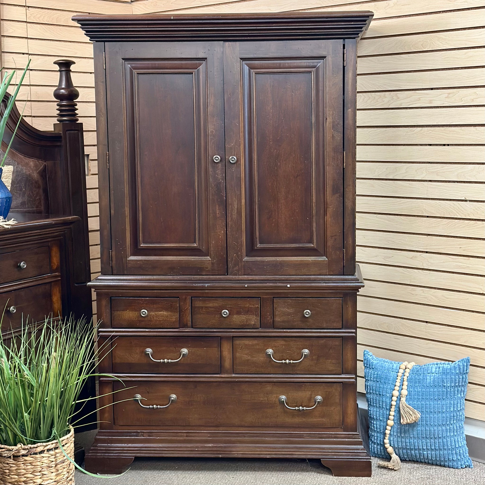 Add this handsome armoire to your bedroom space. Features 8 drawers, two doors with shelves inside, power hookup and a rich wood finish. In good condition.