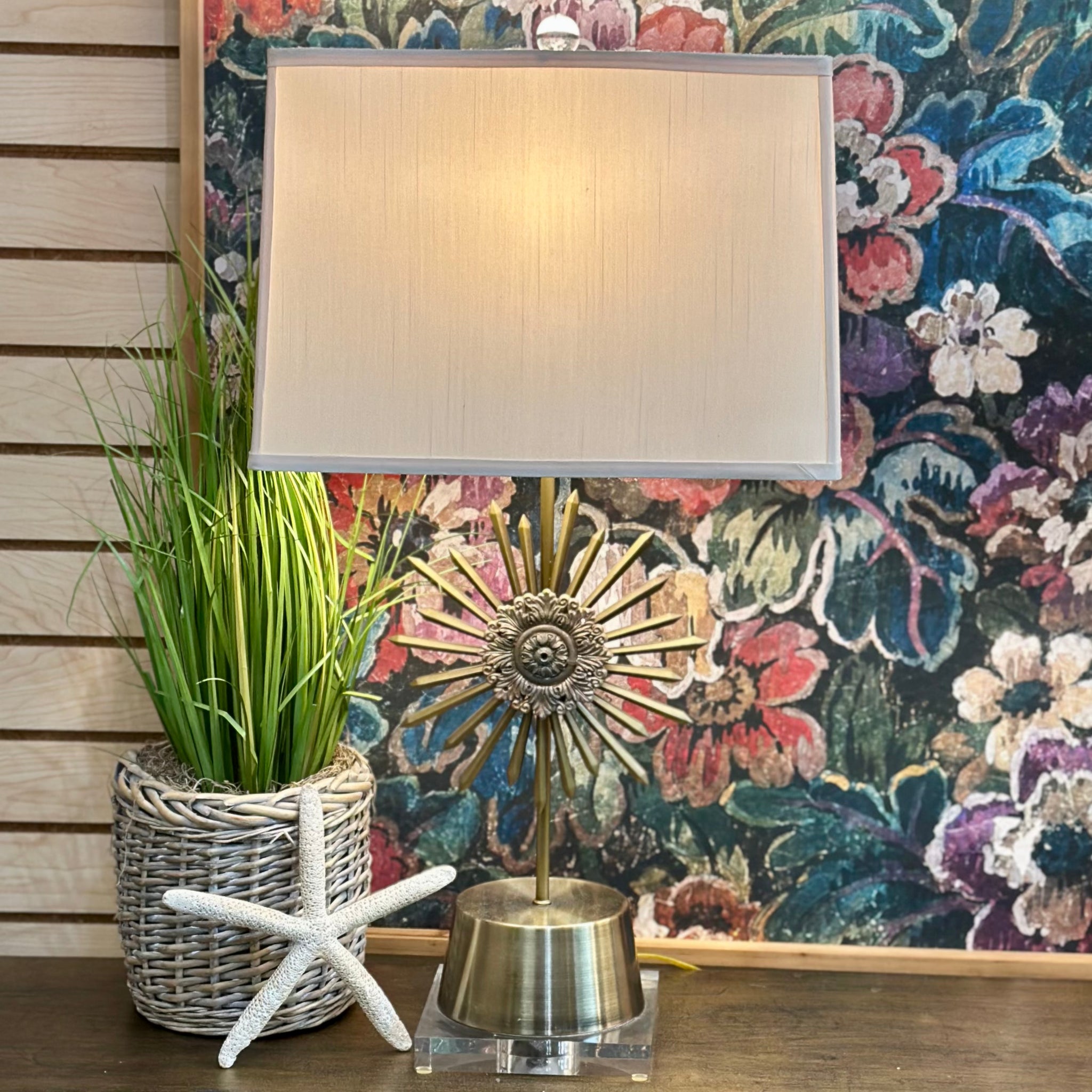 Beautiful gold starbusrt lamp with soft beige shade; on consignment and in excellent condition. Similar lamps retail $200+, our price less!