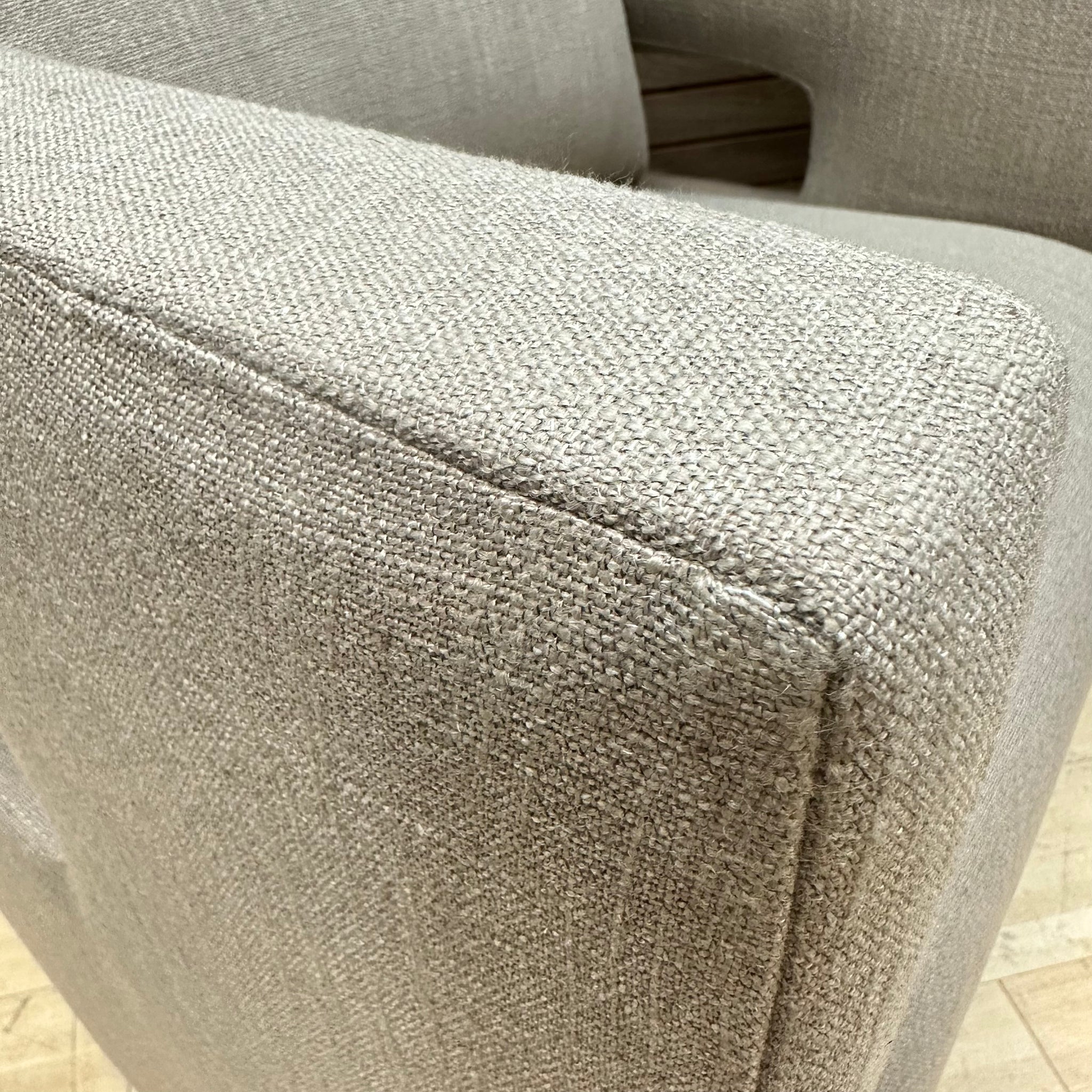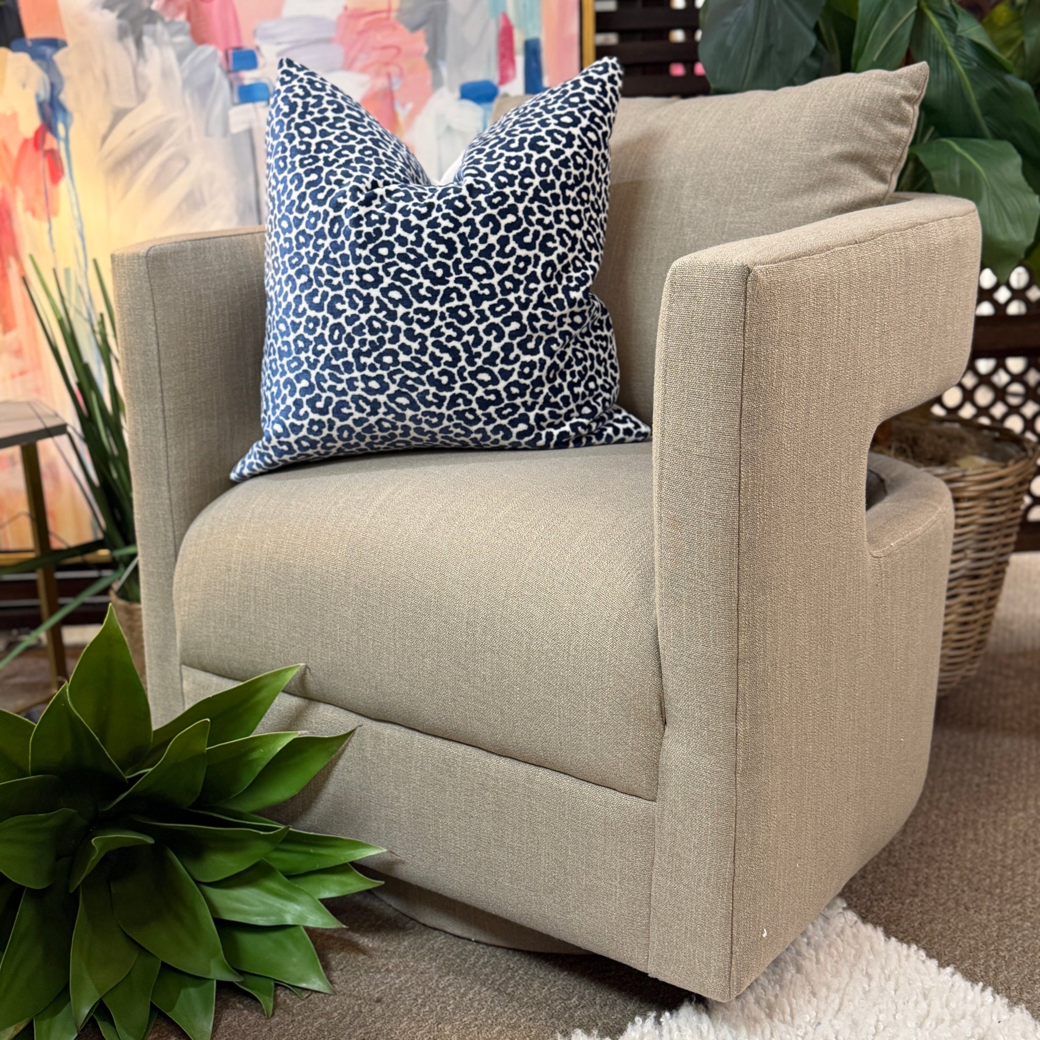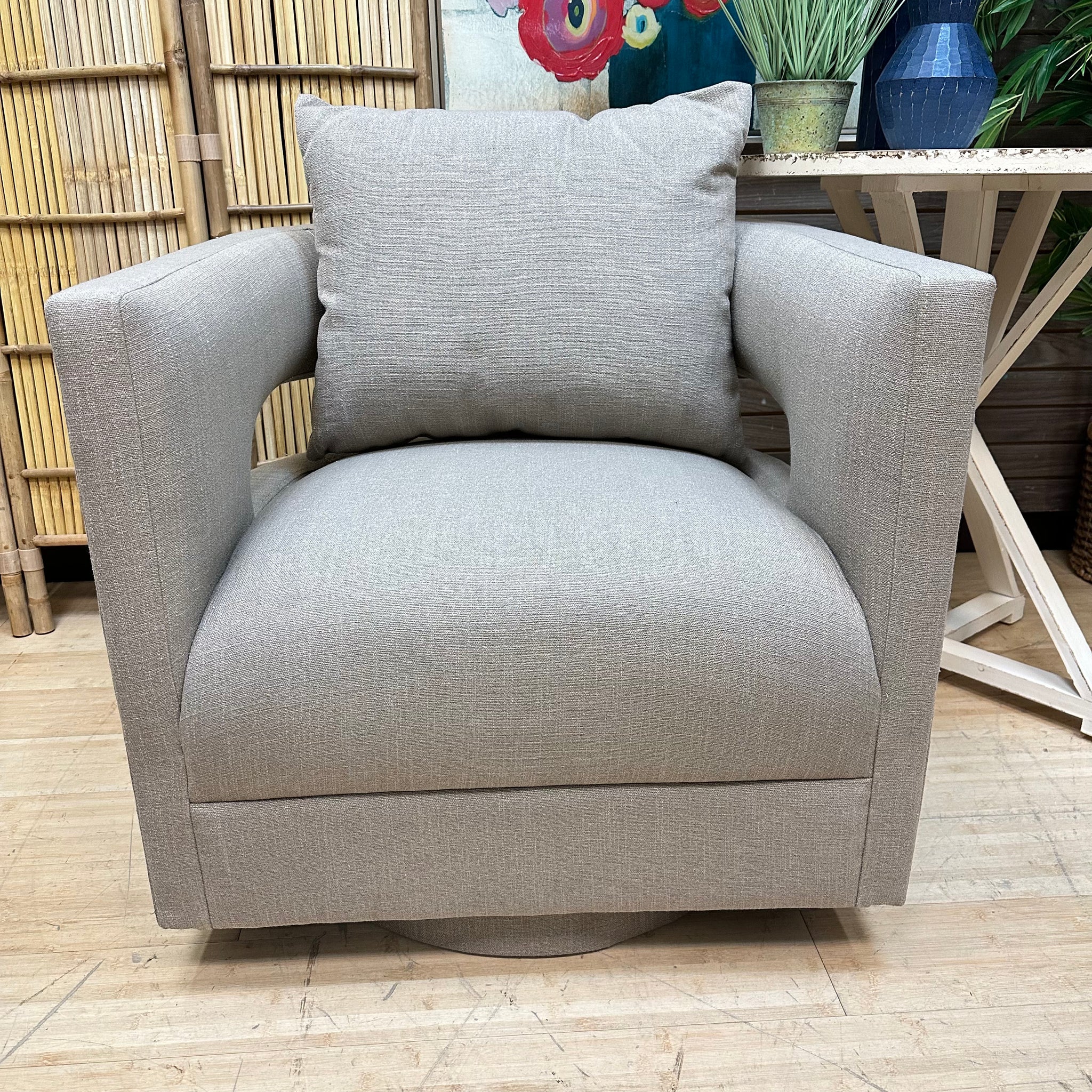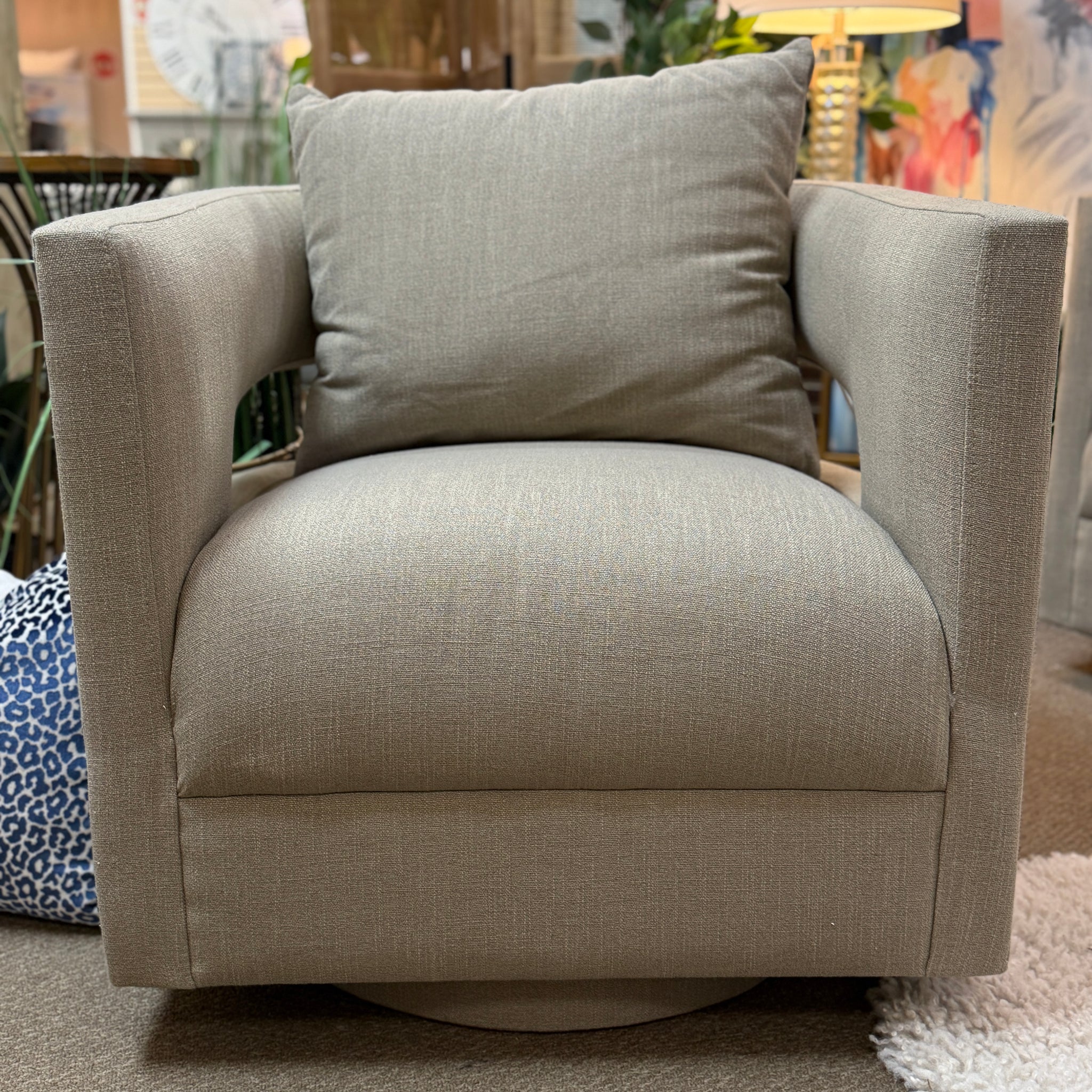 Add modern flair to your room with this taupe swivel chair. Featuring an open back cutout for an airy silhouette and a removable back cushion for added comfort. BRAND NEW.