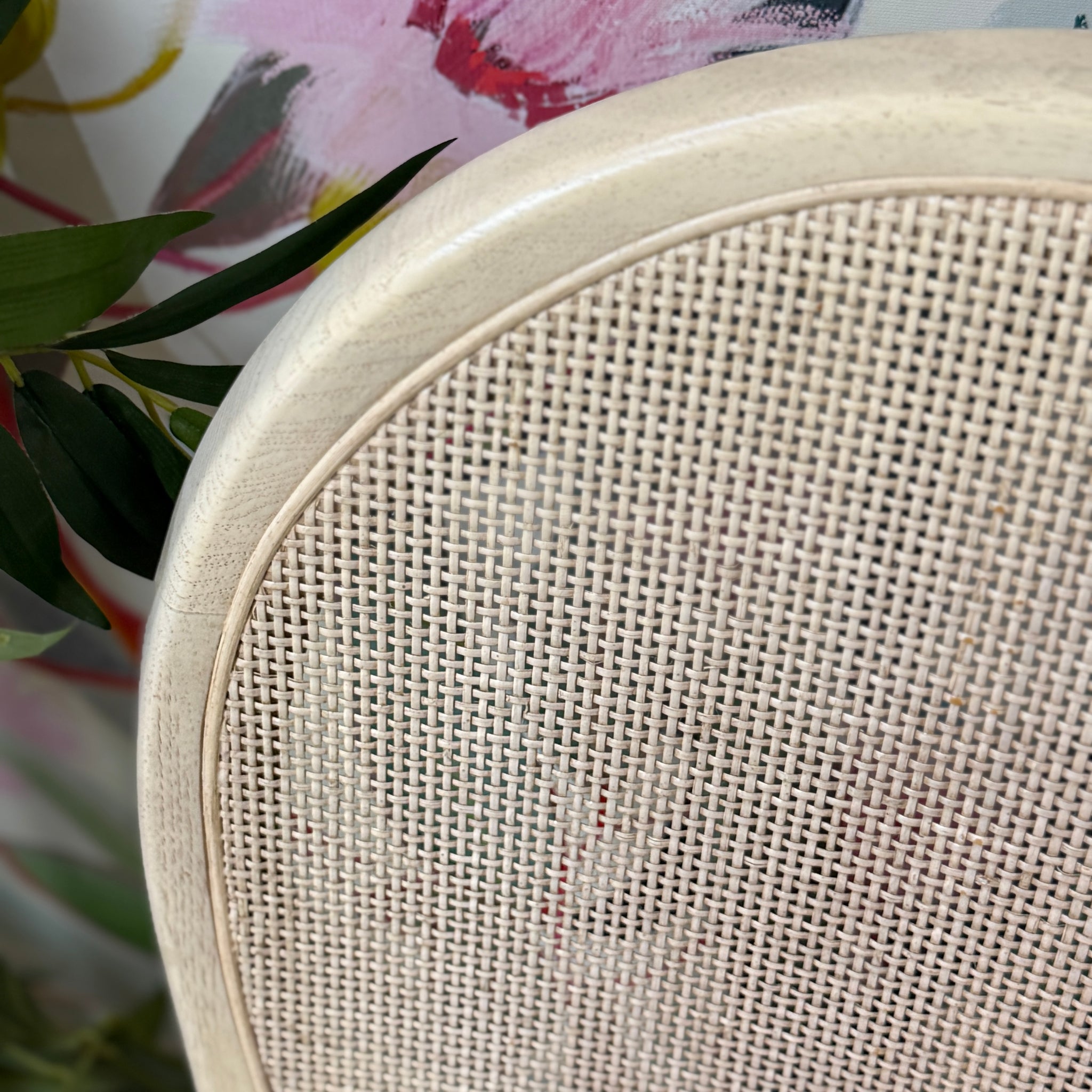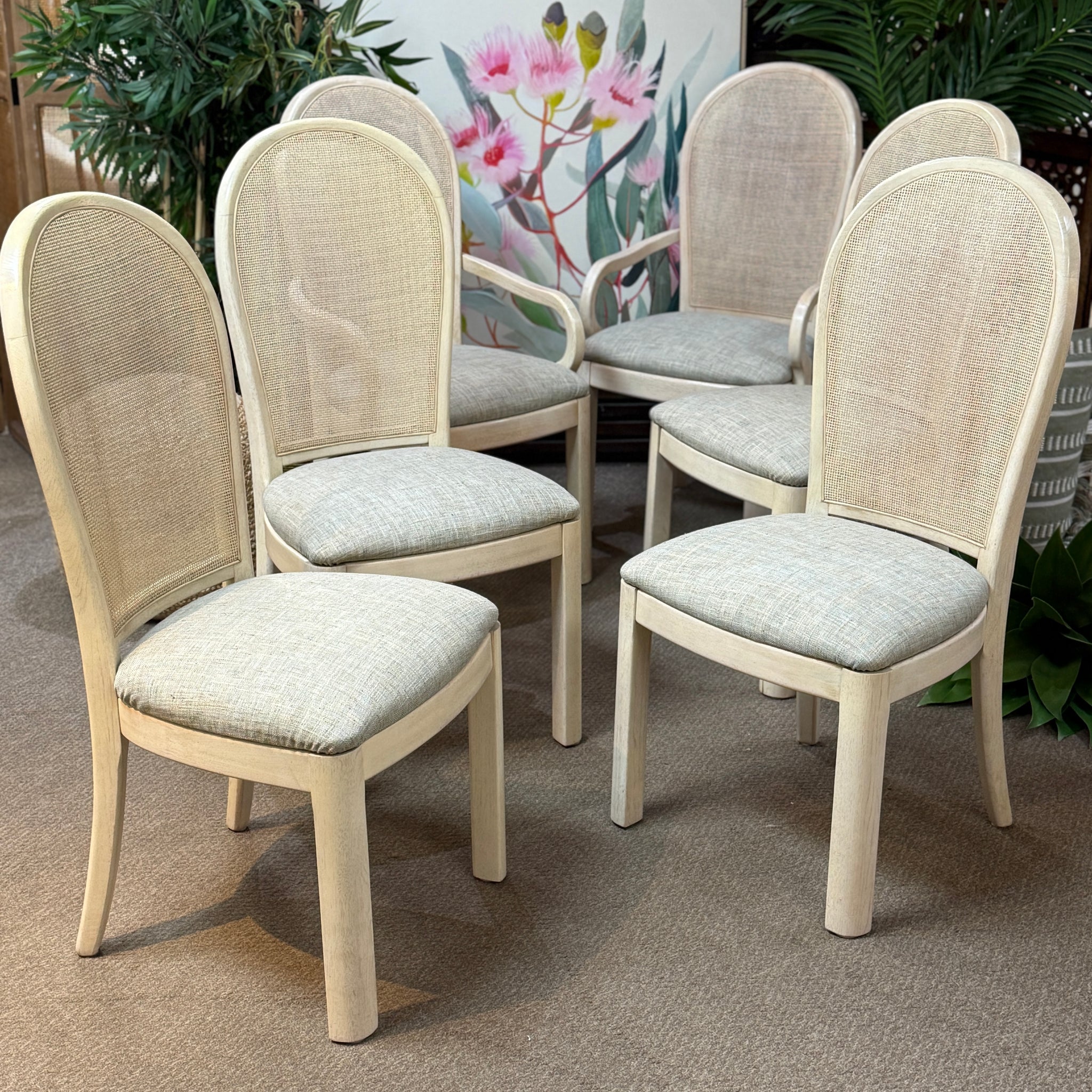 Timeless cane back dining chair by quality maker, Thomasville! Chair has grey upholstered seats and a light beige finish. On consignment and in excellent condition!
