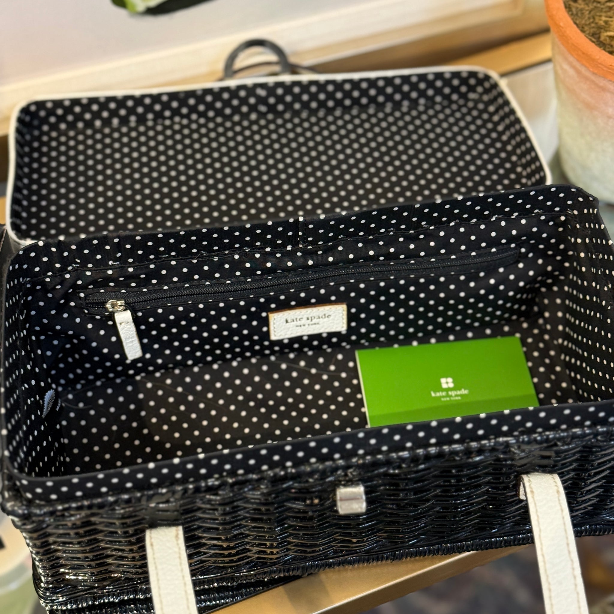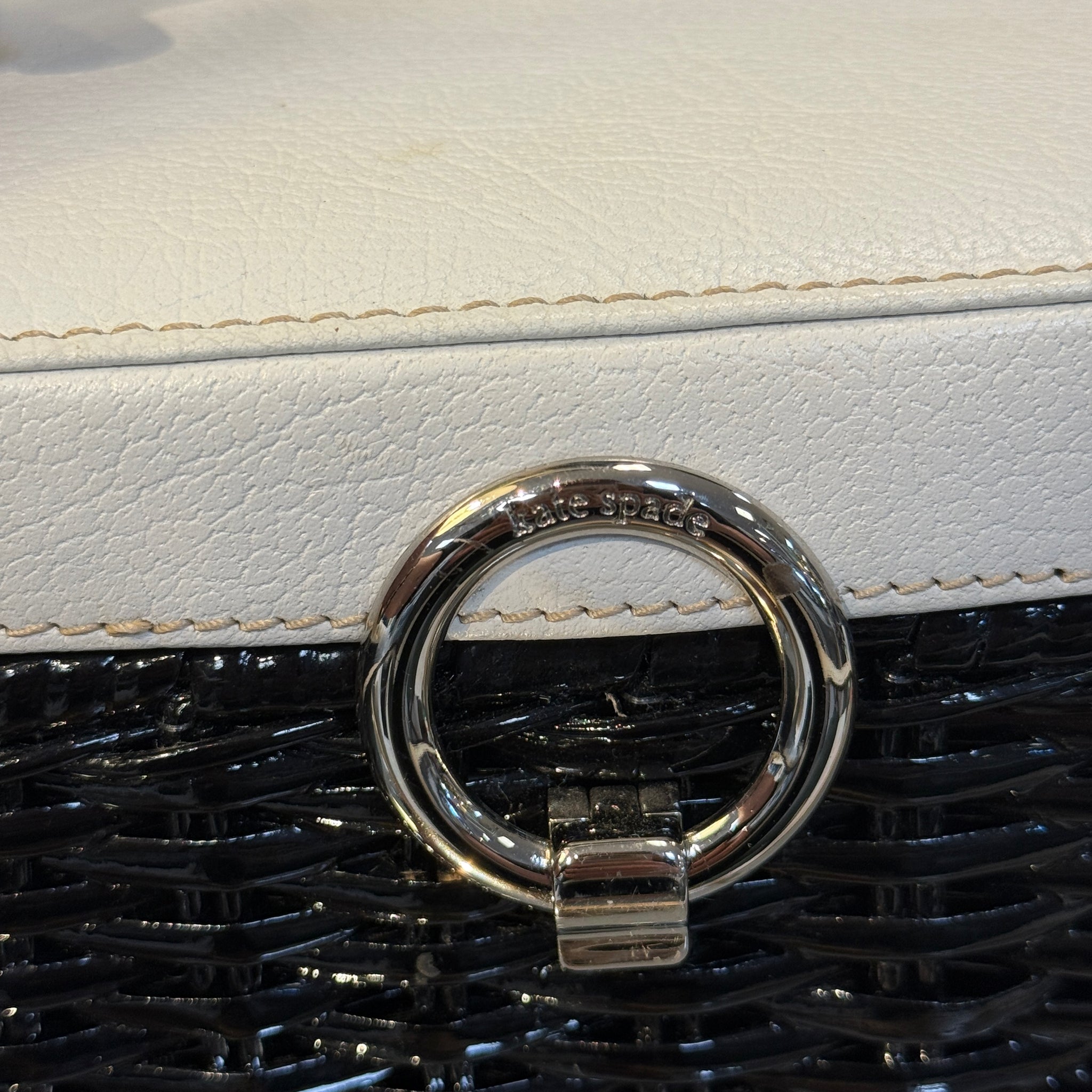 Adorable! Vintage Kate Spade handbag featuring a black wicker base and white leather. Retails $199+, our price less and in great condition! Has some minor stains consistent with use.