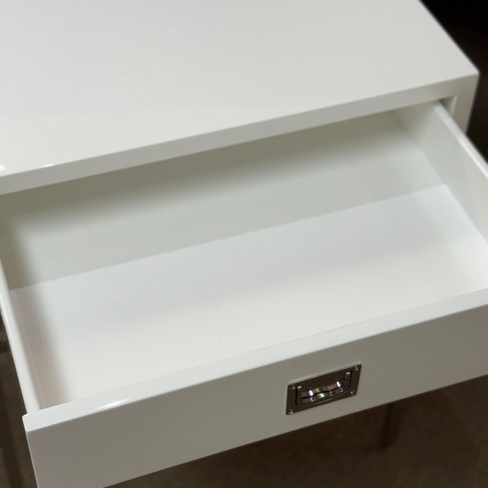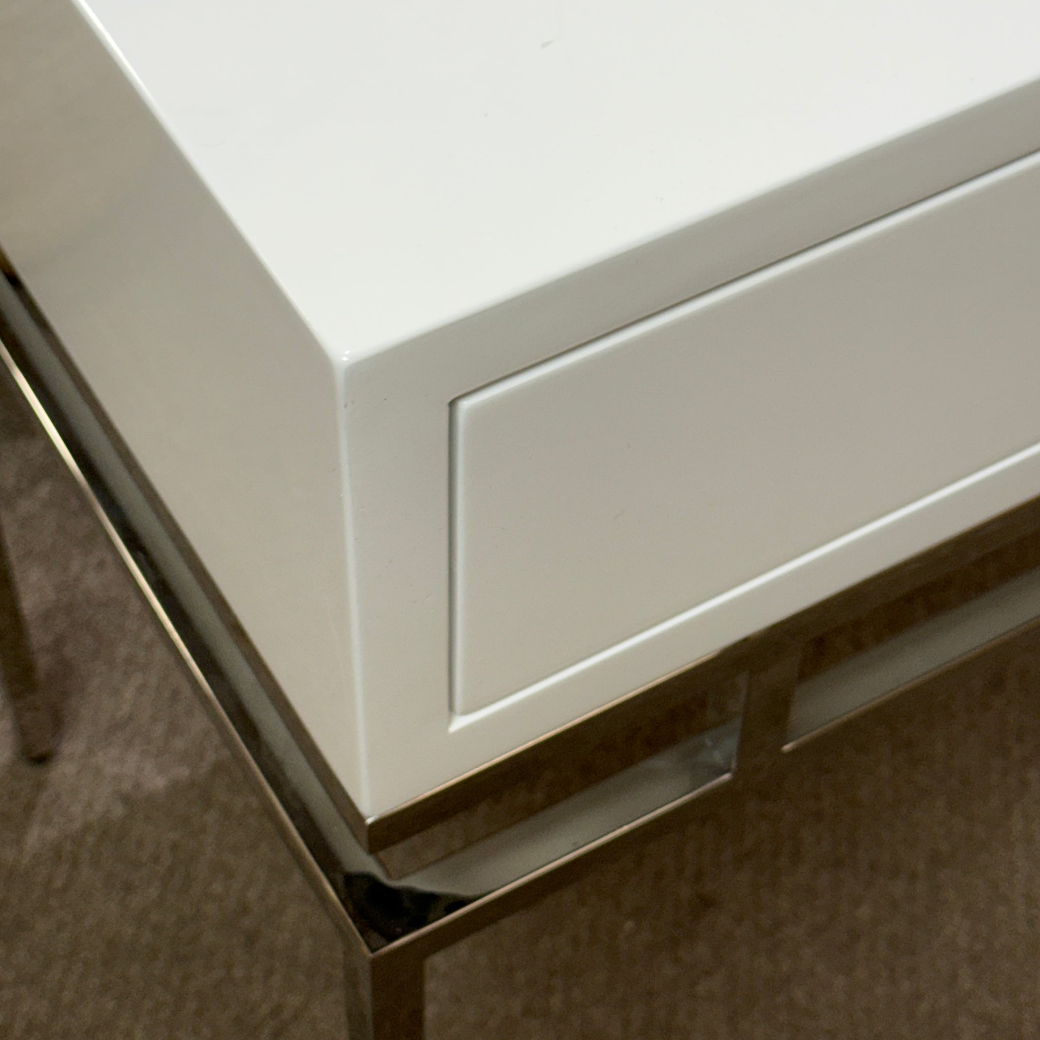 Modern white nightstand with chrome legs. On consignment and in great condition. One nightstand is missing a pull.