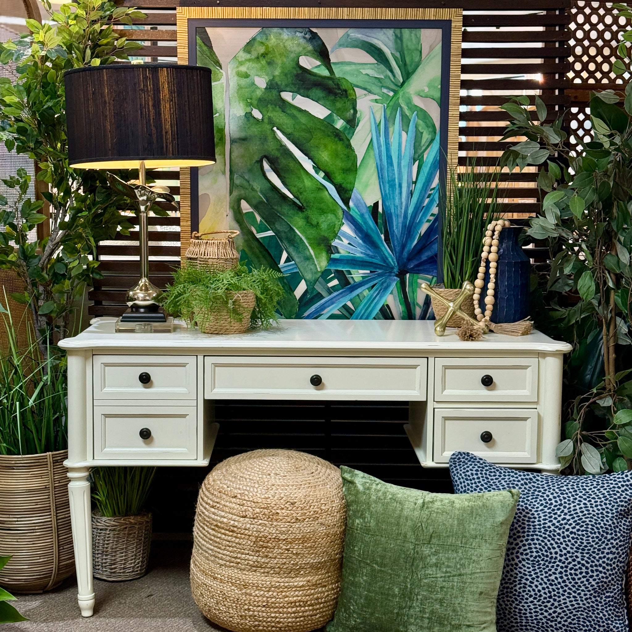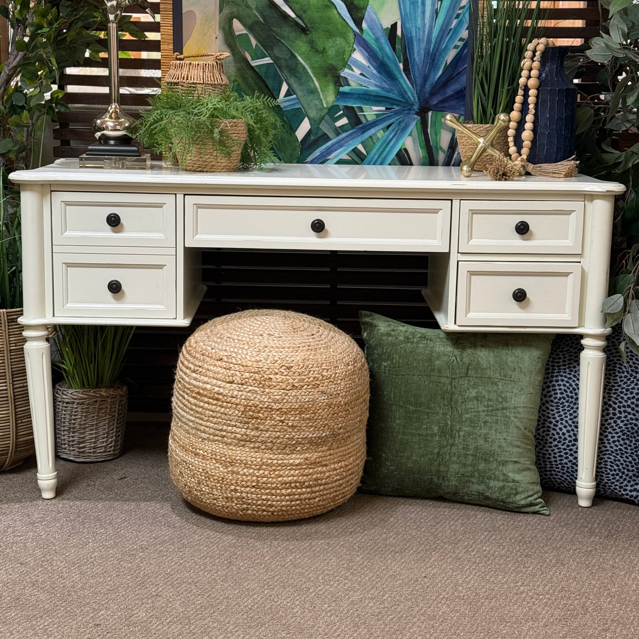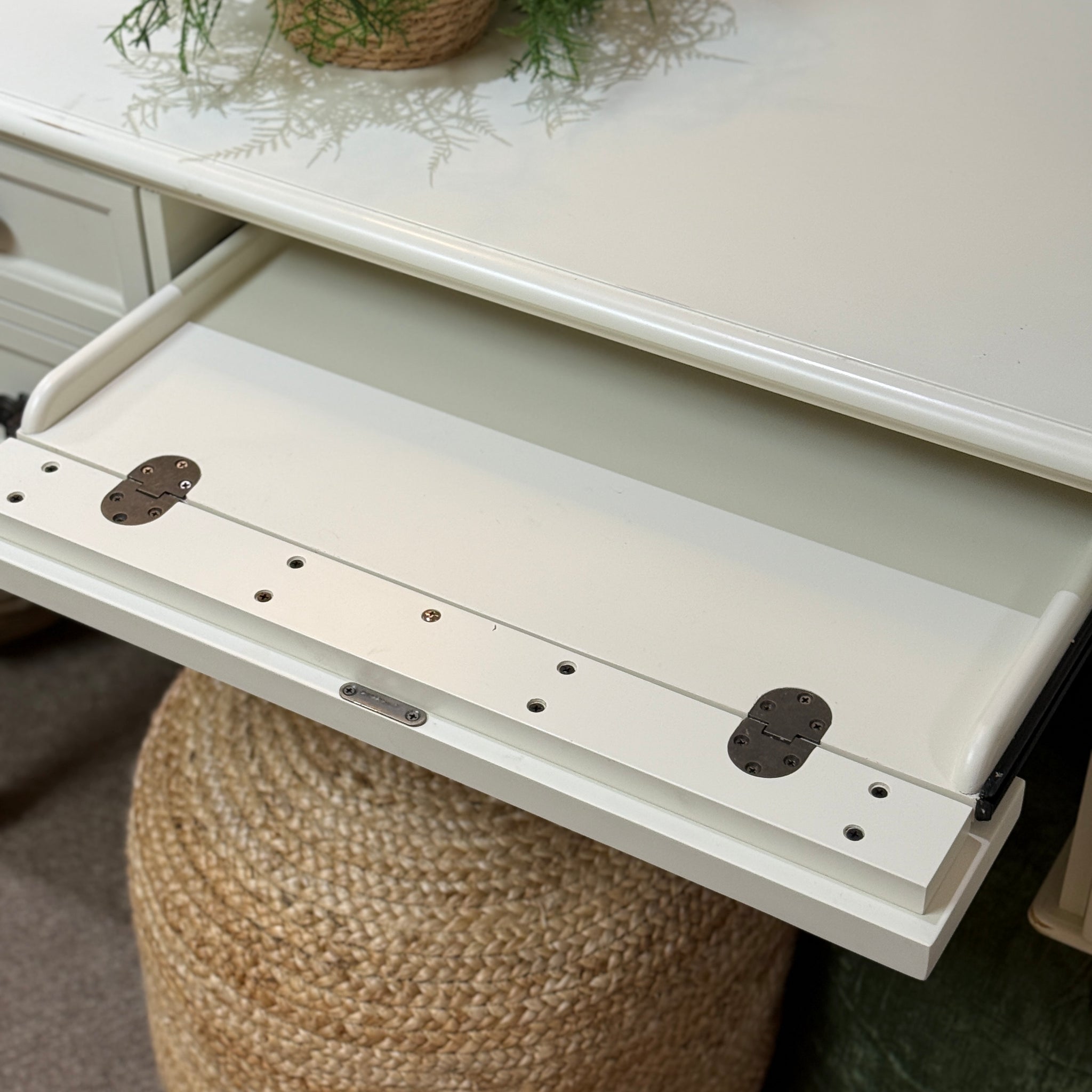 Update your home office using this pretty white desk. Has plenty of storage with a pull down key board tray. On consignment and in great condition.