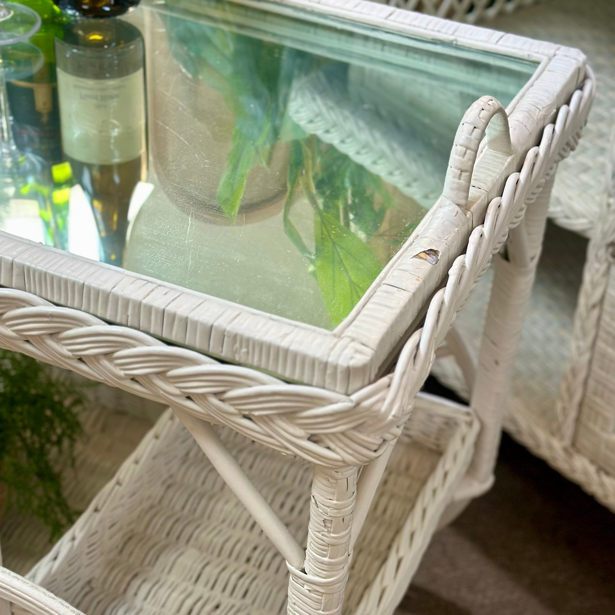 Serve your guests in style with this wicker bar cart. Features a mirrored removable tray, a wheel for easy mobility, and a white finish. In great condition with some minor finish blemishes.