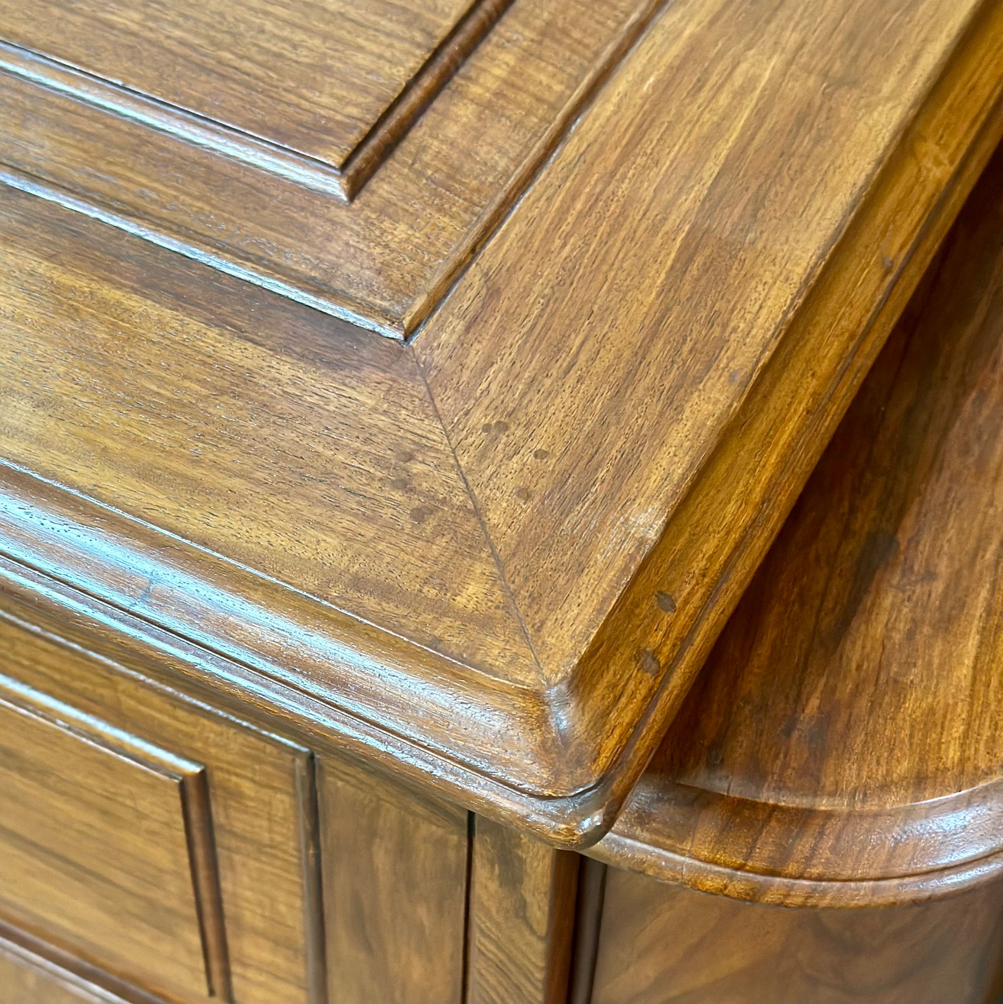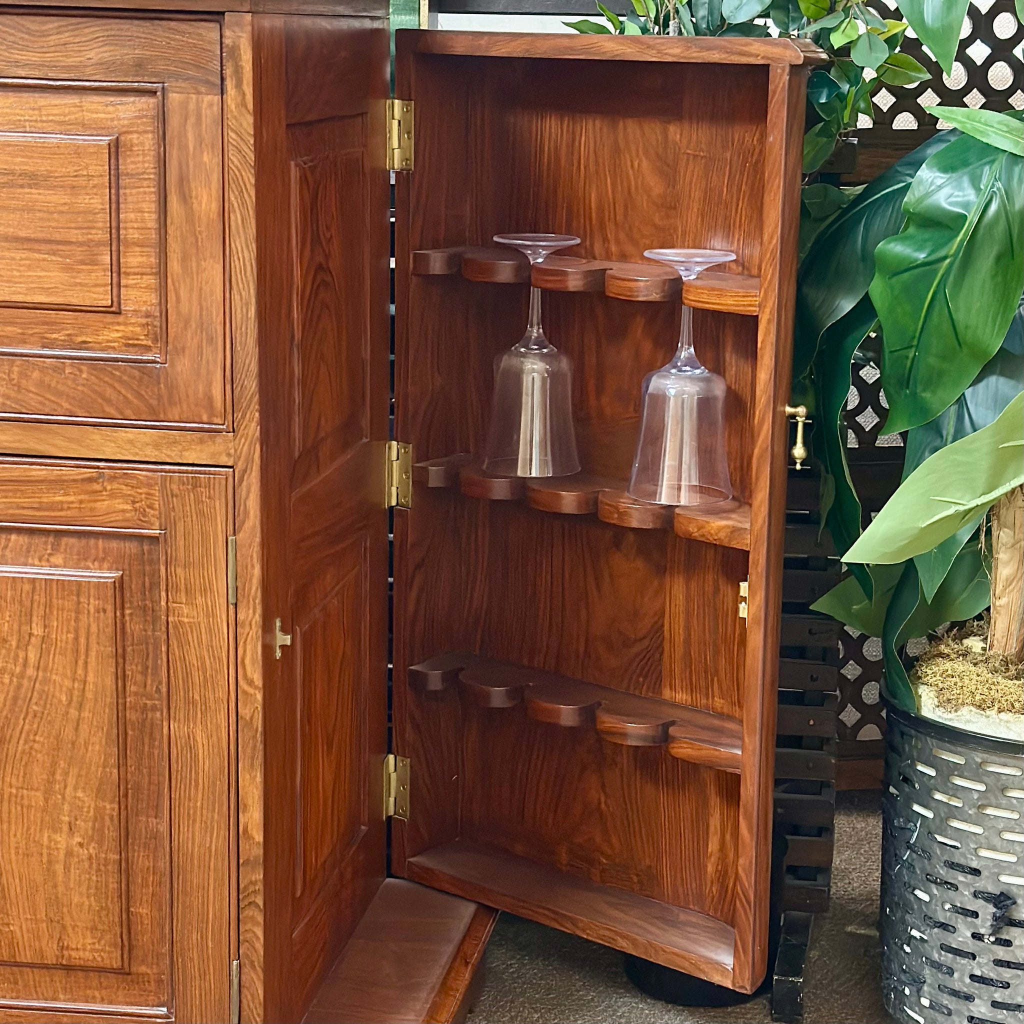 Elevate your dining experience with this beautiful wine bar cabinet. This cabinet is multi-functional with its storage of glasses and bottles. Features mirrored accents and a warm, solid wood finish with brass hardware. On consignment and in great condition!